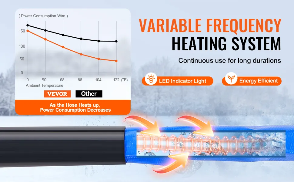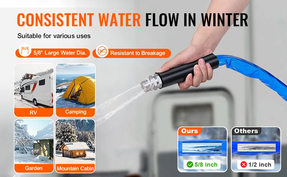 Mantén el flujo en bajas temperaturas: Incluso en noches de invierno con temperaturas de -45 °F/-42.7 °C, nuestra manguera calefactada para autocaravanas garantiza un flujo constante, evitando la congelación y proporcionando un acceso confiable al agua. Disponible en longitudes de 4, 7, 9, 15 y 30 metros, es perfecta para autocaravanas, remolques, barcos, mangueras de jardín, riego de plantas y lavado de autos en invierno.