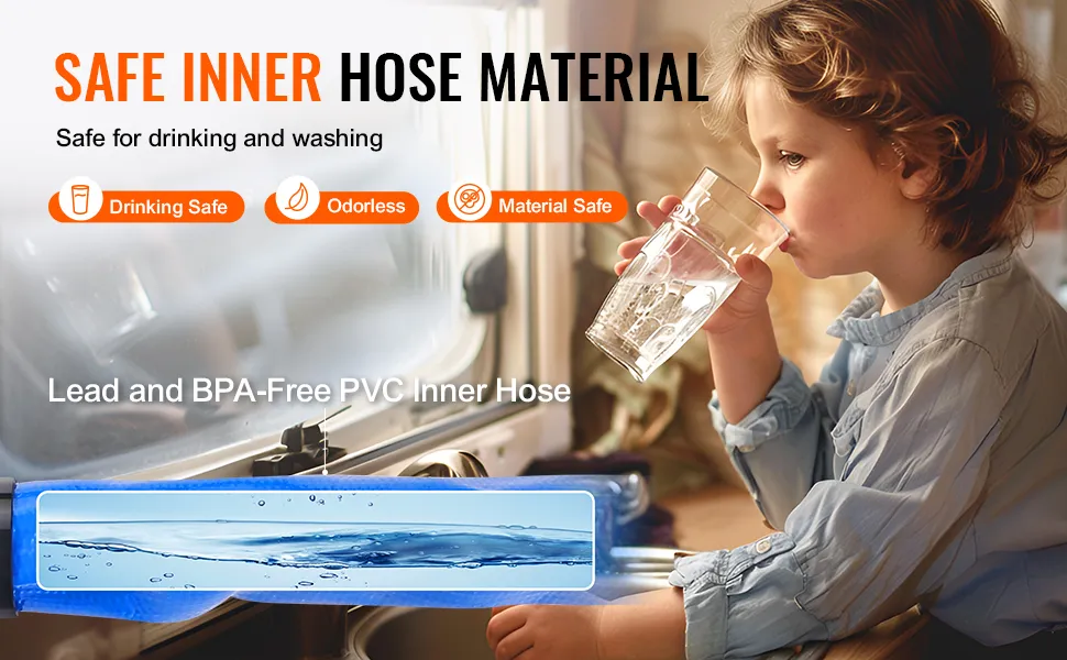 La manguera interior de PVC es segura para beber agua, libre de plomo y BPA, manteniendo el agua limpia para beber, bañarse y regar las plantas.