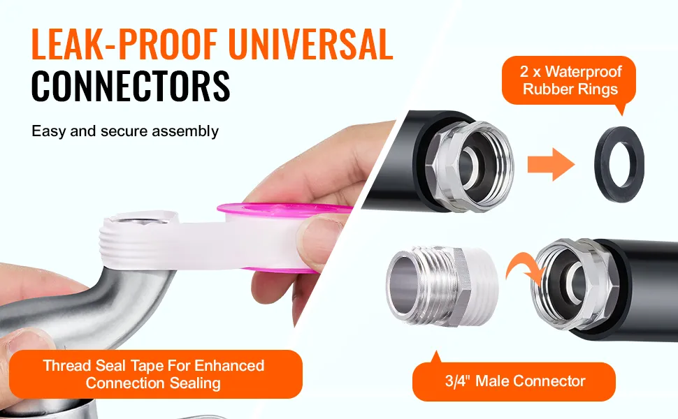 Conectores de manguera a prueba de fugas: Equipados con un conector de aluminio GHT de 1,9 cm (3/4"), compatible con la mayoría de las fuentes de agua de EE. UU. Compatibles con mangueras de jardín y exterior, lo que los convierte en un accesorio versátil. Incluye anillos de goma impermeables y cinta selladora de roscas para un sellado óptimo.