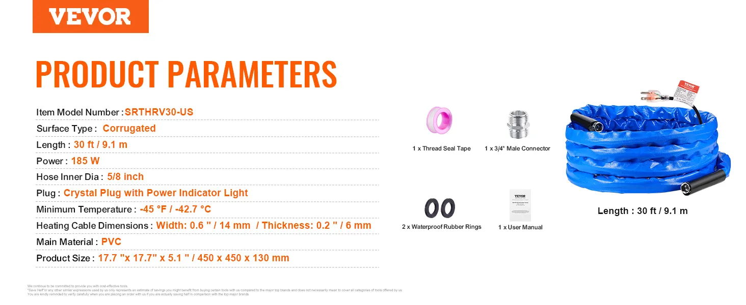 VEVOR 30ft Heated Water Hose for RV, Heated Drinking Water Hose with Corrugated Cover Antifreeze to -45°F, Automatic Self-regulating, 5/8" I.D. with 3/4" GHT Adapter, Lead and BPA Free