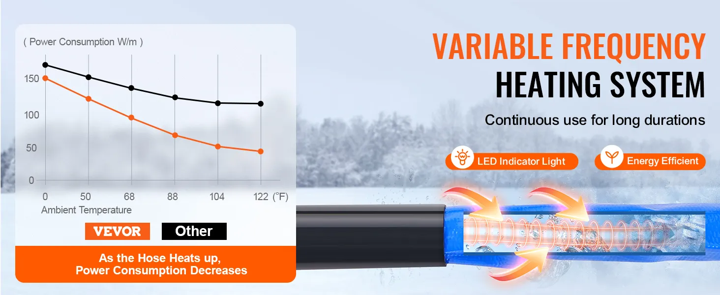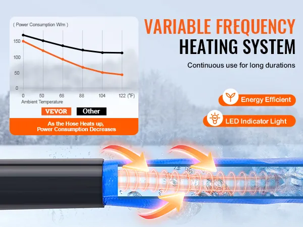 Even Heating & Low Energy Consumption: The indicator light turns on when heating is in progress. The built-in heating element inside the water hose is 0.6" / 14 mm wide, wrapped in a textured outer layer that expands the heating surface for more even heat distribution. As the hose warms up, power consumption gradually decreases.