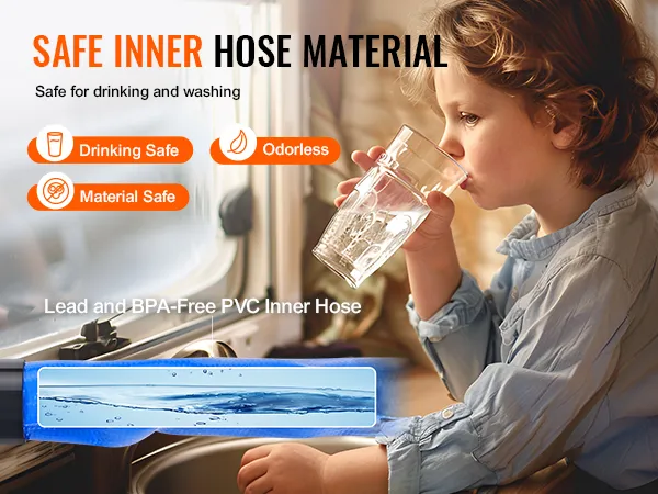 The PVC inner hose is drinking water-safe, free from lead and BPA, keeping the water clean for drinking, bathing, and watering plants.