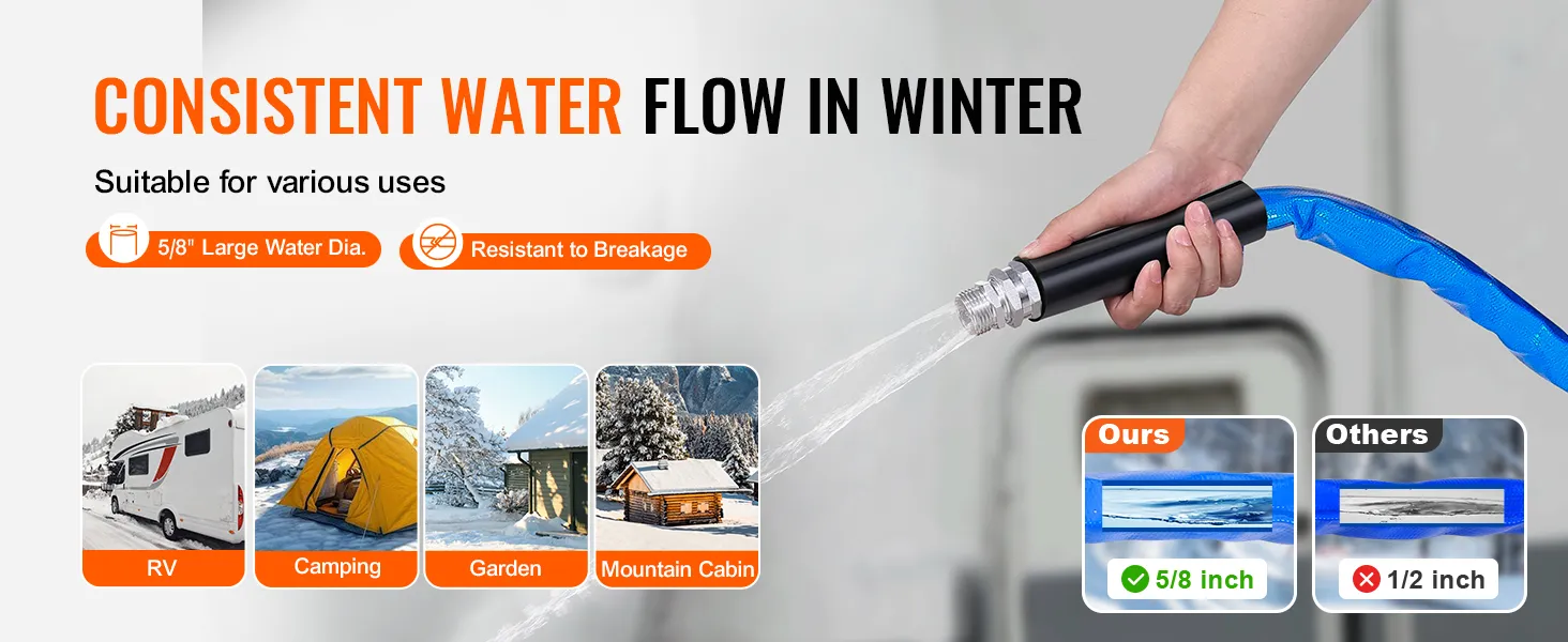 Stay Flowing in Low Temps: Even when winter nights drop to -45°F/-42.7℃, our heated RV water hose ensures steady water flow, preventing freezing and providing reliable water access. Available in 15, 25, 30, 50, and 100 ft lengths, it's perfect for RVs, trailers, boats, garden hoses, plant watering, and car washing in winter.