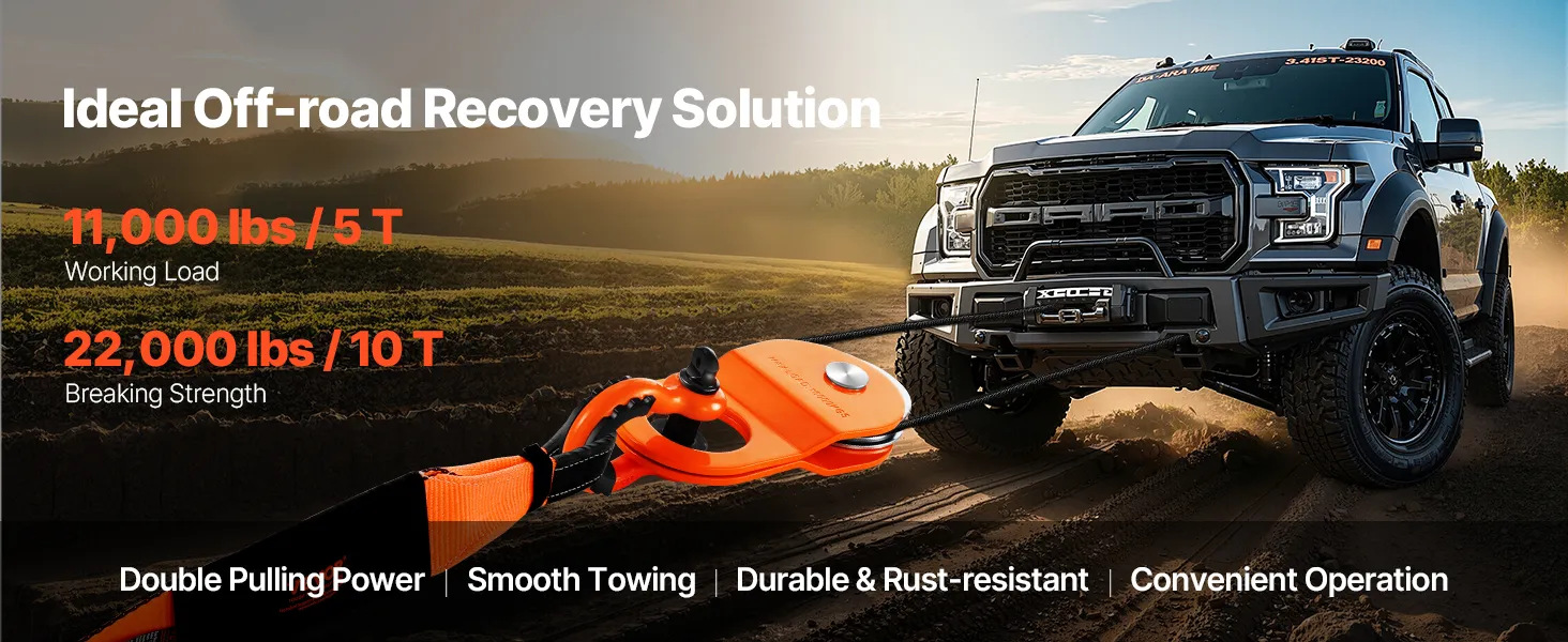 La polea del cabrestante le permite cambiar la dirección de tracción con suavidad. Funciona en espacios reducidos y ángulos complicados, incluso sin un punto fijo. ¡Ajuste la dirección de recuperación fácilmente para una elevación eficiente y cómoda!