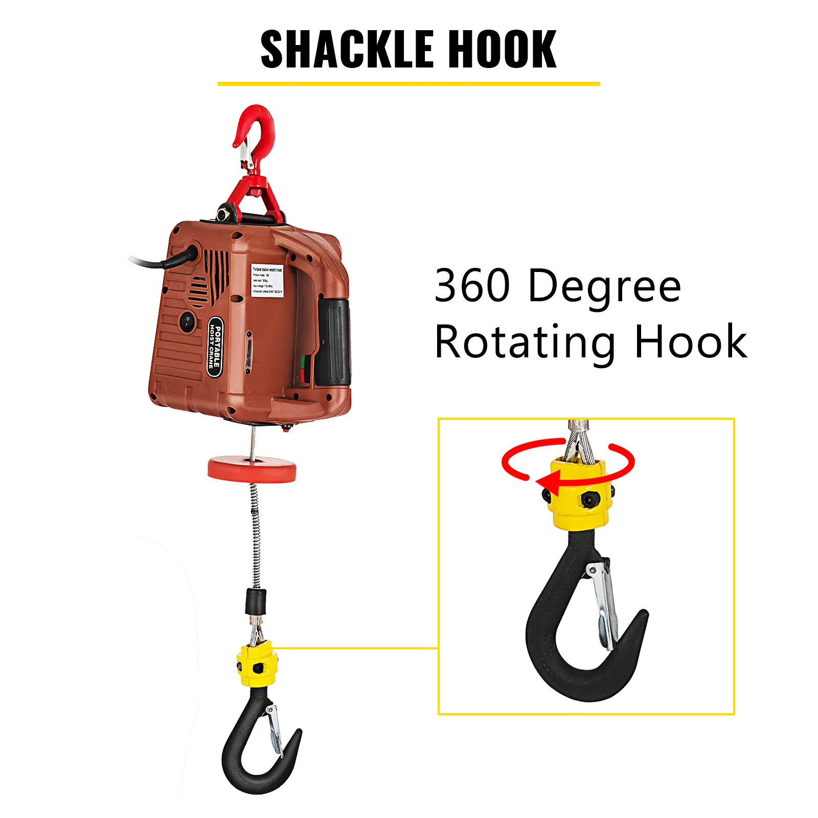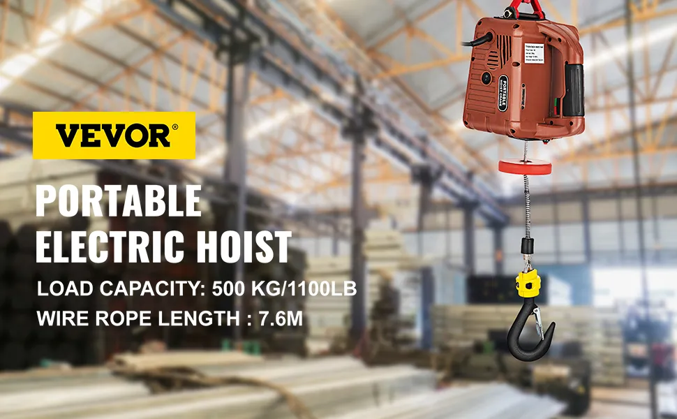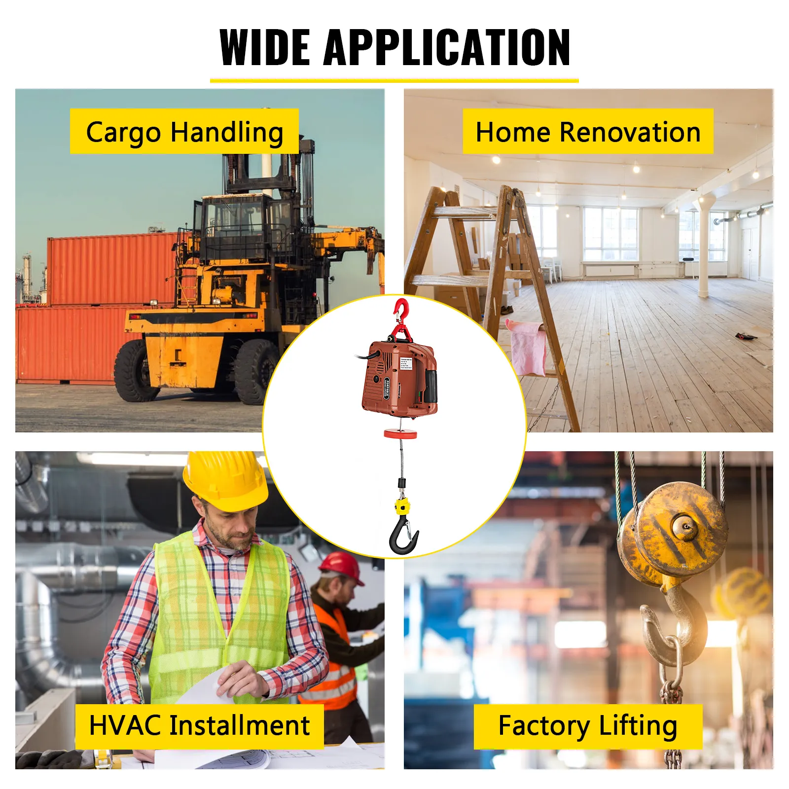 Aquí hay una lista sobre el polipasto eléctrico portátil. Con el gancho de aleación de acero, el motor completamente de cobre y la caja de engranajes de aluminio, su capacidad de carga máxima puede alcanzar los 500 kg. Es una herramienta de manejo de materiales ideal para maquinaria, industria, agricultura, pesca, reparación de automóviles, construcción y otros campos para levantar y mover aplicaciones pesadas.