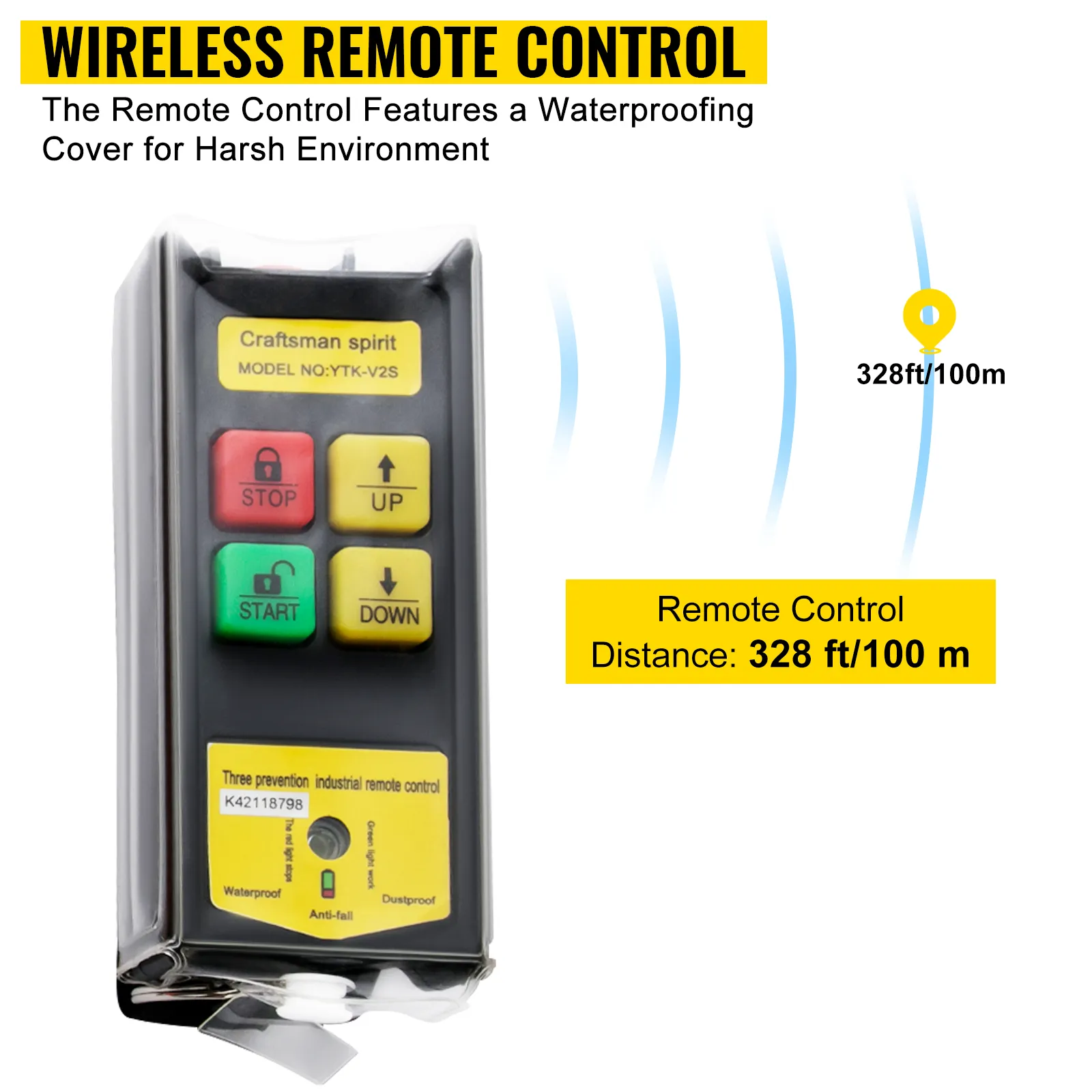 Ponemos a su disposición un mando a distancia inalámbrico con botón de parada de emergencia, que le permite subir y bajar cargas desde una distancia segura. Además, el control remoto cuenta con una cubierta impermeable para un entorno hostil, y la distancia del control remoto alcanza los 328 pies/100 m.