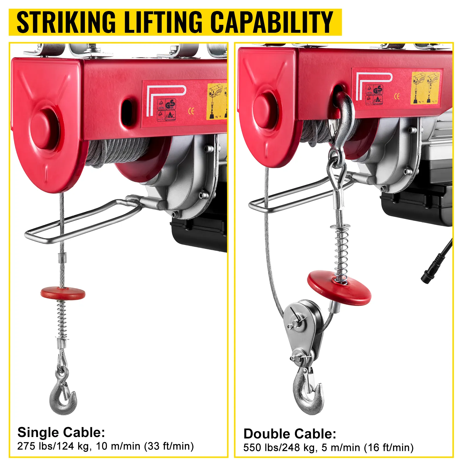 - Capacidad de elevación: 275 lbs/124 kg (cable único), 550 lbs/248 kg (cable doble)
