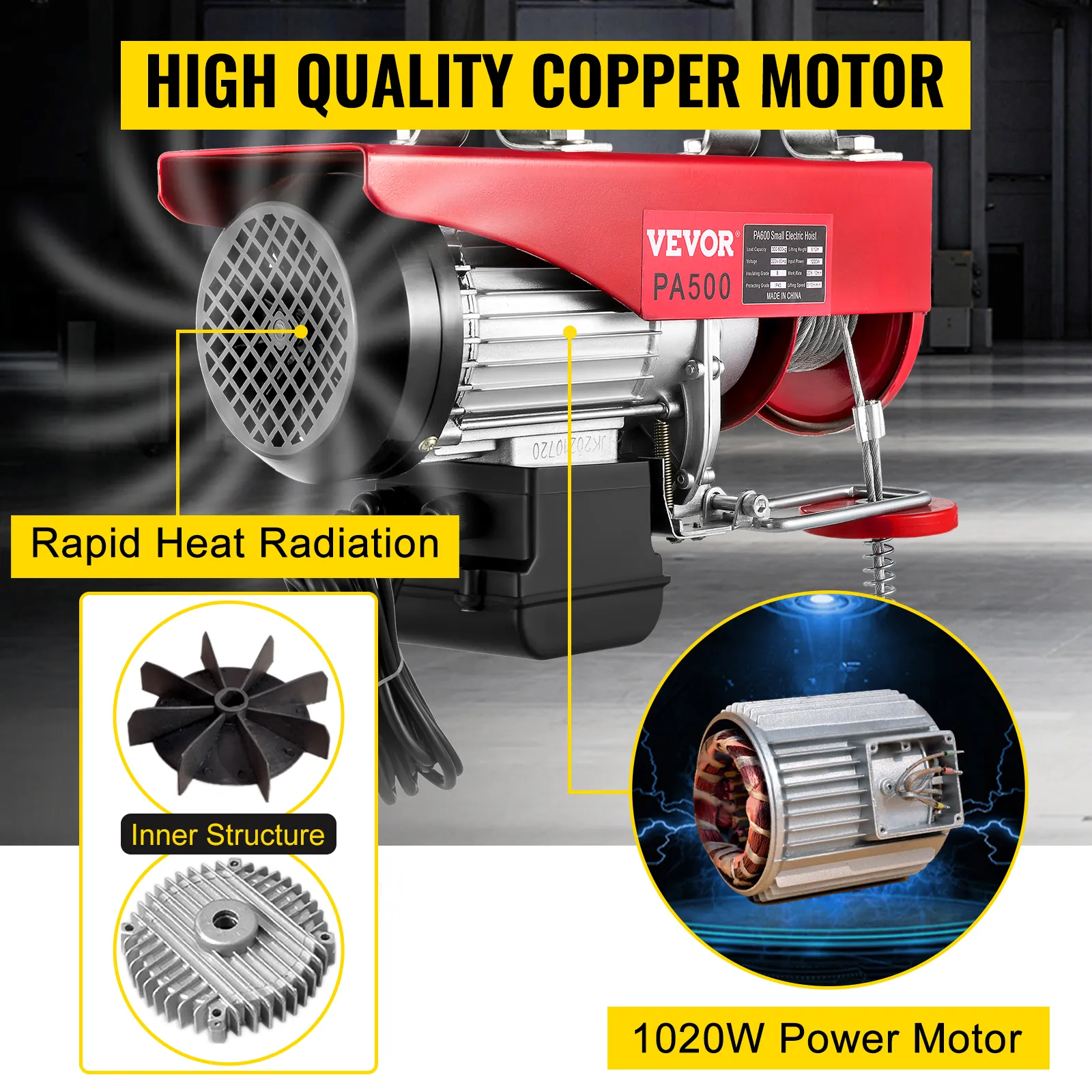 Motor de cobre de 1020 W y parada de emergencia y cable de acero antirrotación
