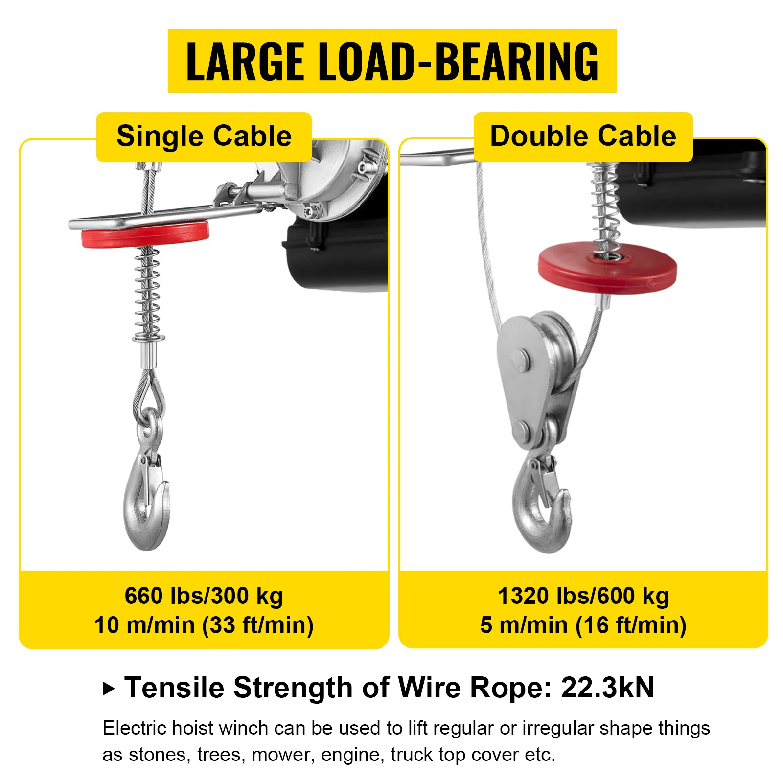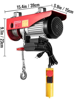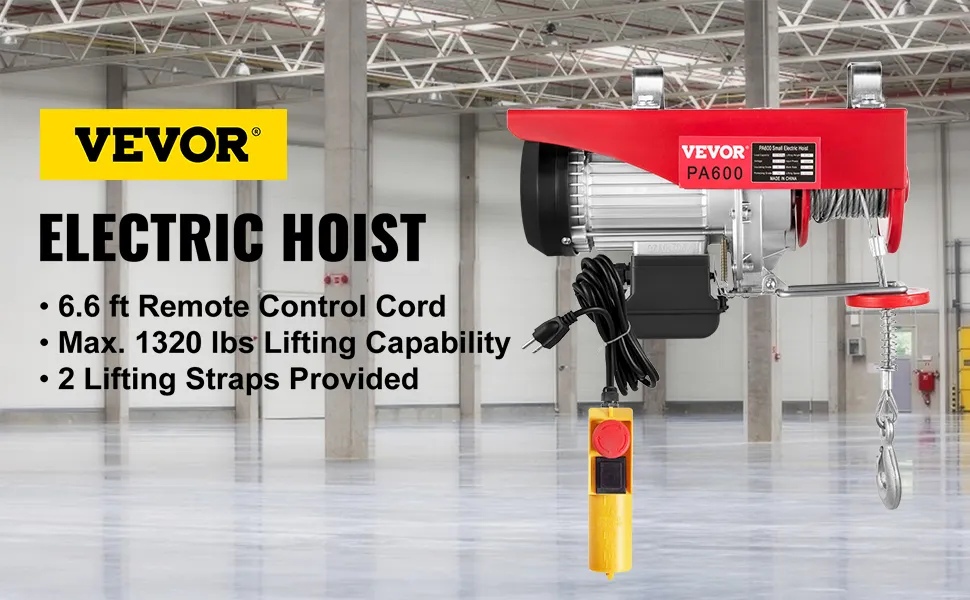 - Este polipasto eléctrico, que cuenta con una capacidad de carga de 1320 lbs/600 kg, es muy adecuado para levantar motores, mesas, madera y equipos de taller, sin necesidad de subir escaleras. Se puede usar para levantar cosas de forma regular o irregular como piedras, árboles, cortacésped, motor, etc. Puede cargar y soltar a una distancia segura a través del control remoto. Este es un cabrestante eléctrico ideal para escenarios de gran alcance en la carga de equipos pesados.