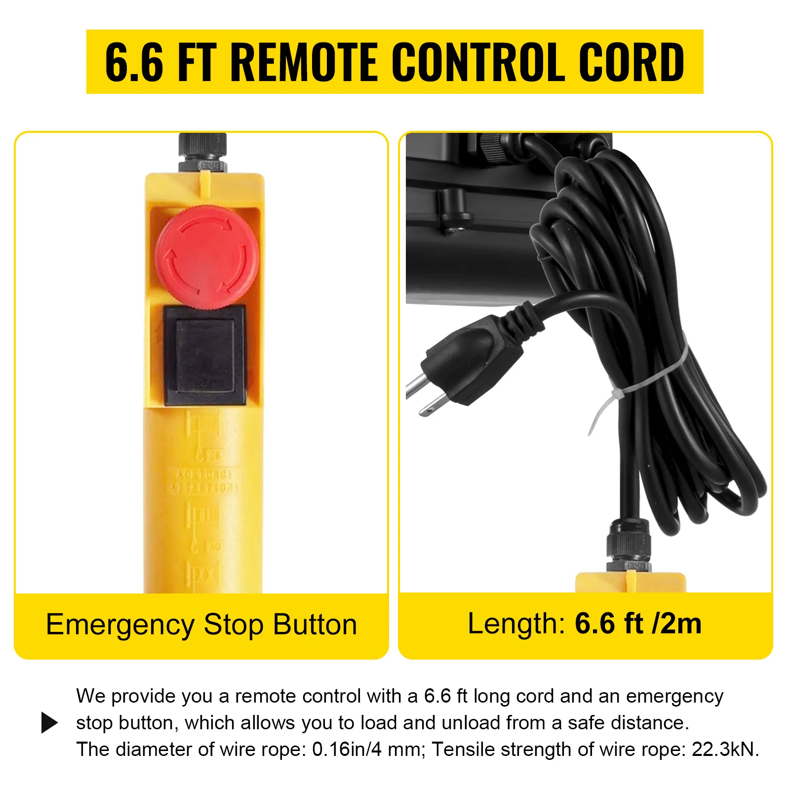 Ponemos a tu disposición un mando a distancia con cable de 2 metros y botón de parada de emergencia, que te permite cargar y descargar desde una distancia segura. El control remoto presenta el material duradero para entornos hostiles. El diámetro de la cuerda de alambre: 0.16in/4 mm; Resistencia a la tracción del cable de acero: 22,3 kN.