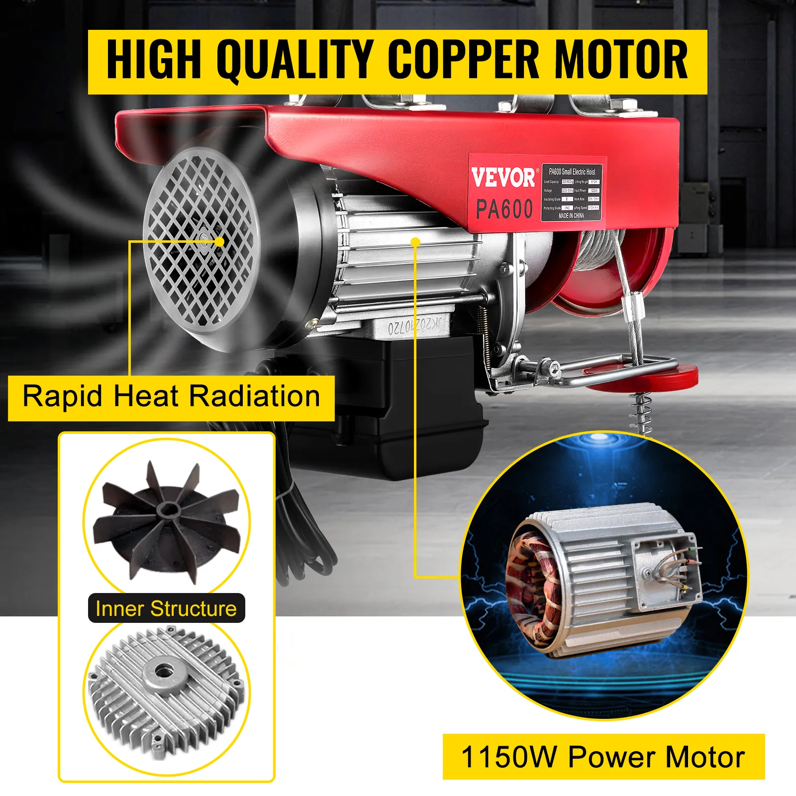 Motor de cobre de 1150 W, parada de emergencia y cable de acero antirrotación