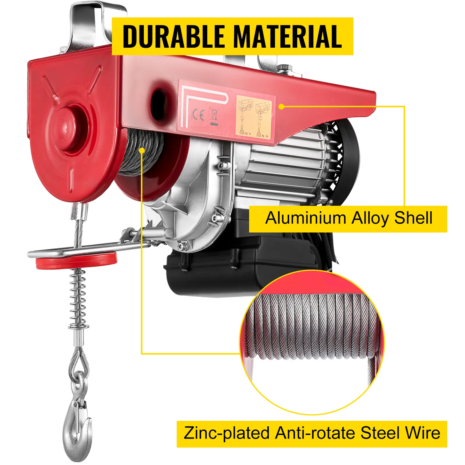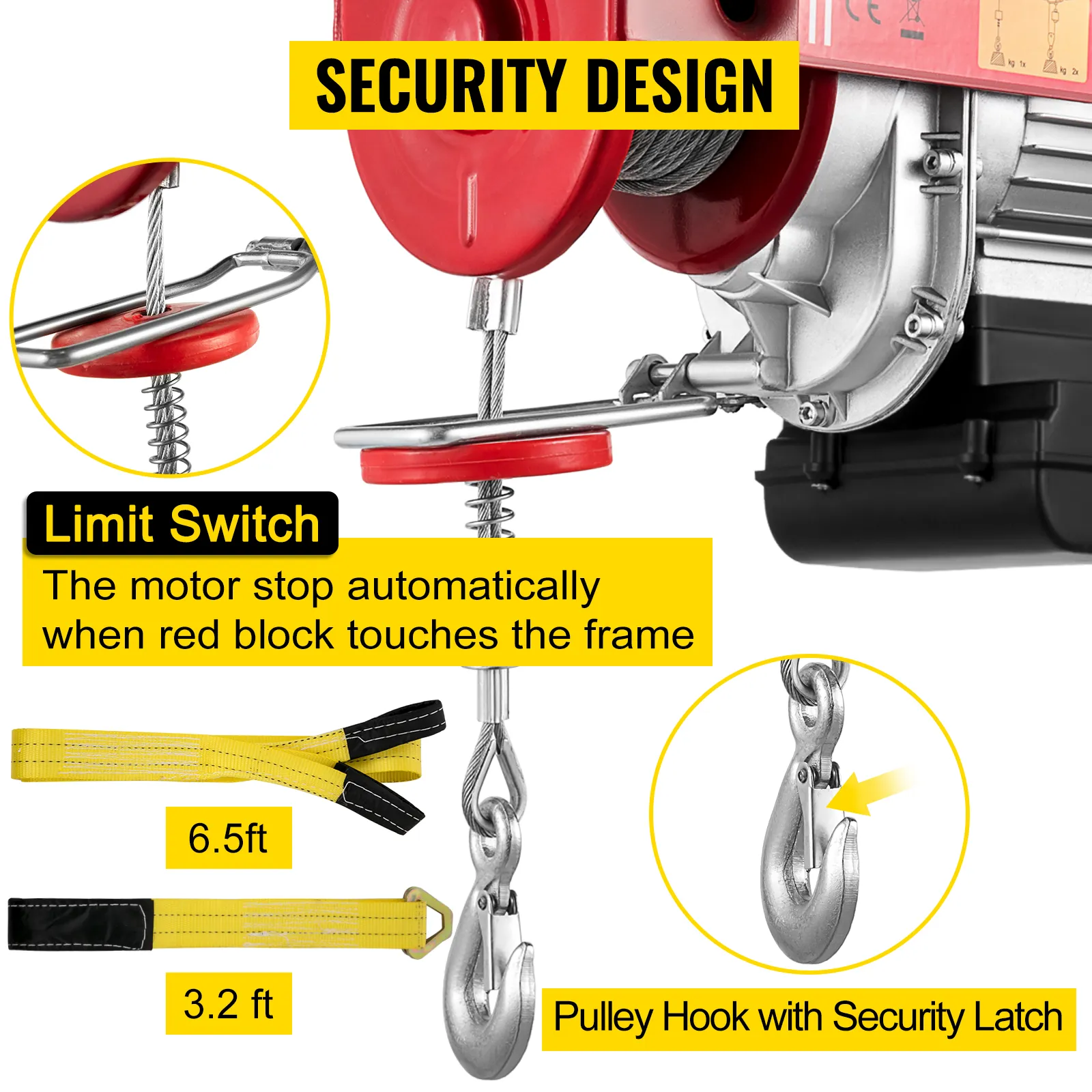 Cuando el bloque rojo toca el interruptor de límite, el motor se detiene automáticamente para evitar que las cadenas se sobrecarguen. Además, el alambre de acero antirrotación cincado es menos probable que se tuerza y es más seguro que el promedio.