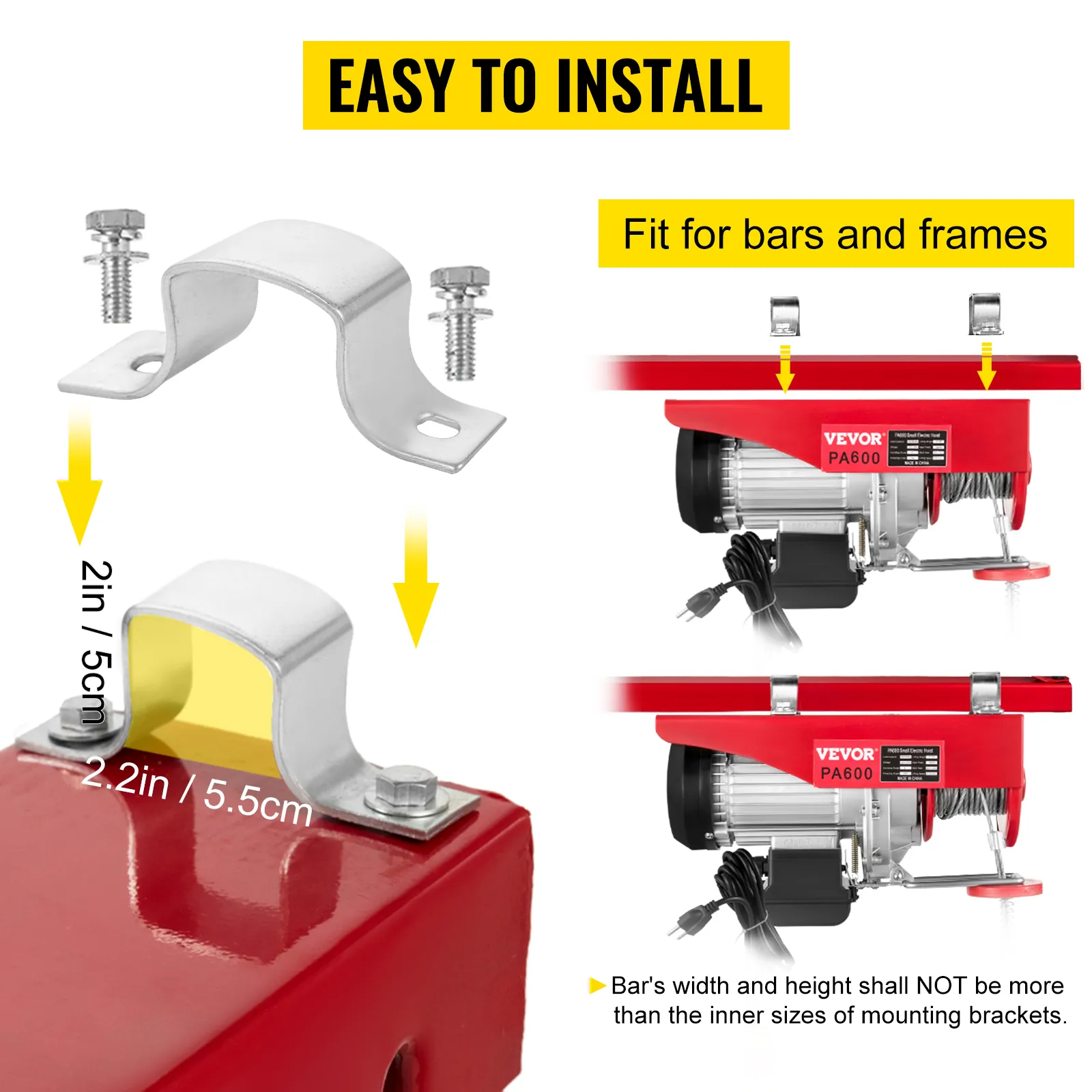 Proporcionamos dos correas de elevación adicionales para el uso necesario. Utilice una barra de metal cuadrada o rectangular para fijar el polipasto. Y el ancho y la altura de la barra no superarán el tamaño interior de los soportes de montaje.