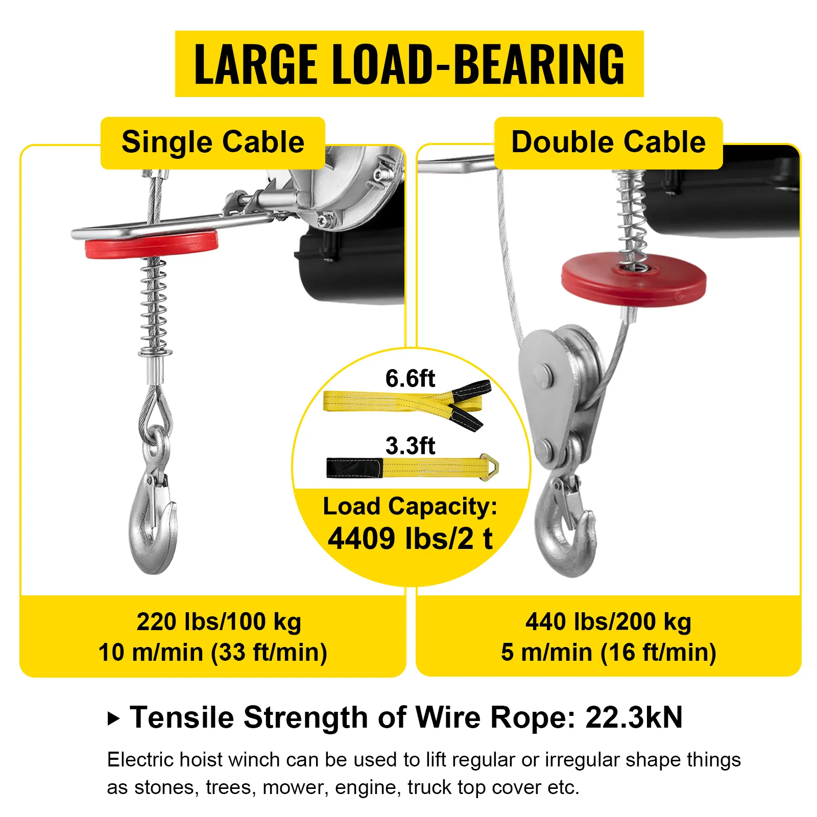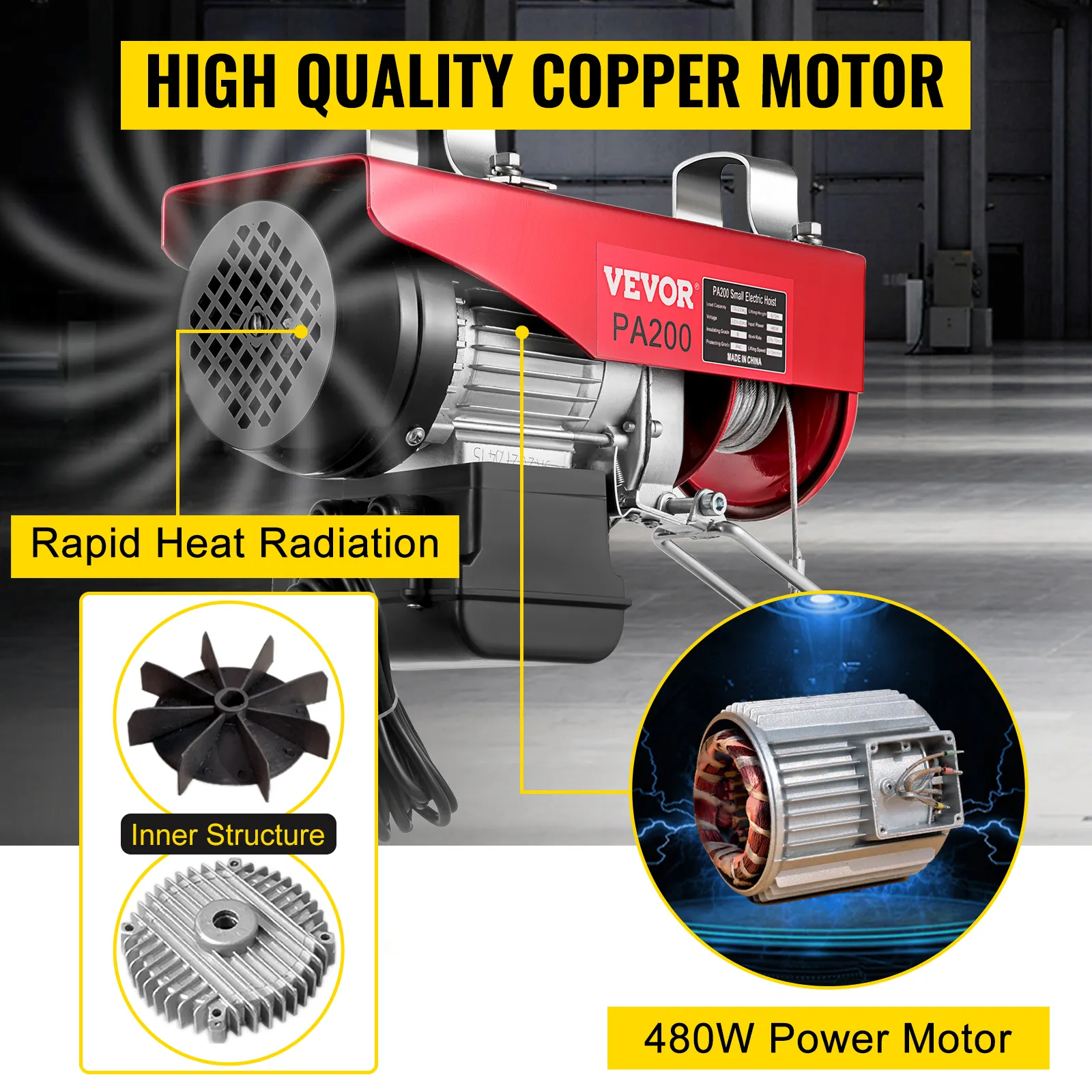 Motor de cobre puro y capacidad de carga de 440 lbs/200 kg y cable de acero antigiro