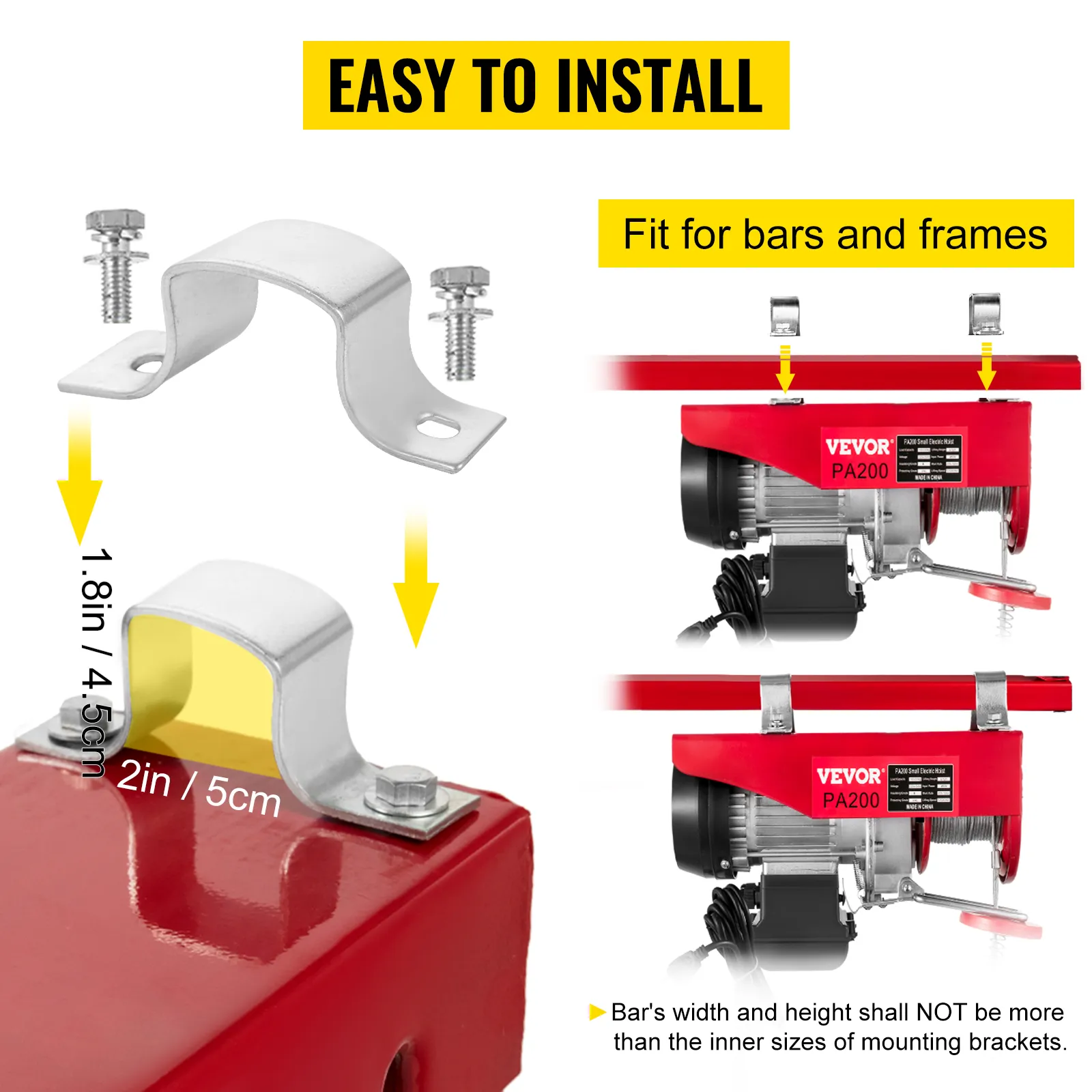 Proporcionamos dos correas de elevación adicionales para el uso necesario. Utilice una barra de metal cuadrada o rectangular para fijar el polipasto. Y el ancho y la altura de la barra no superarán el tamaño interior de los soportes de montaje.