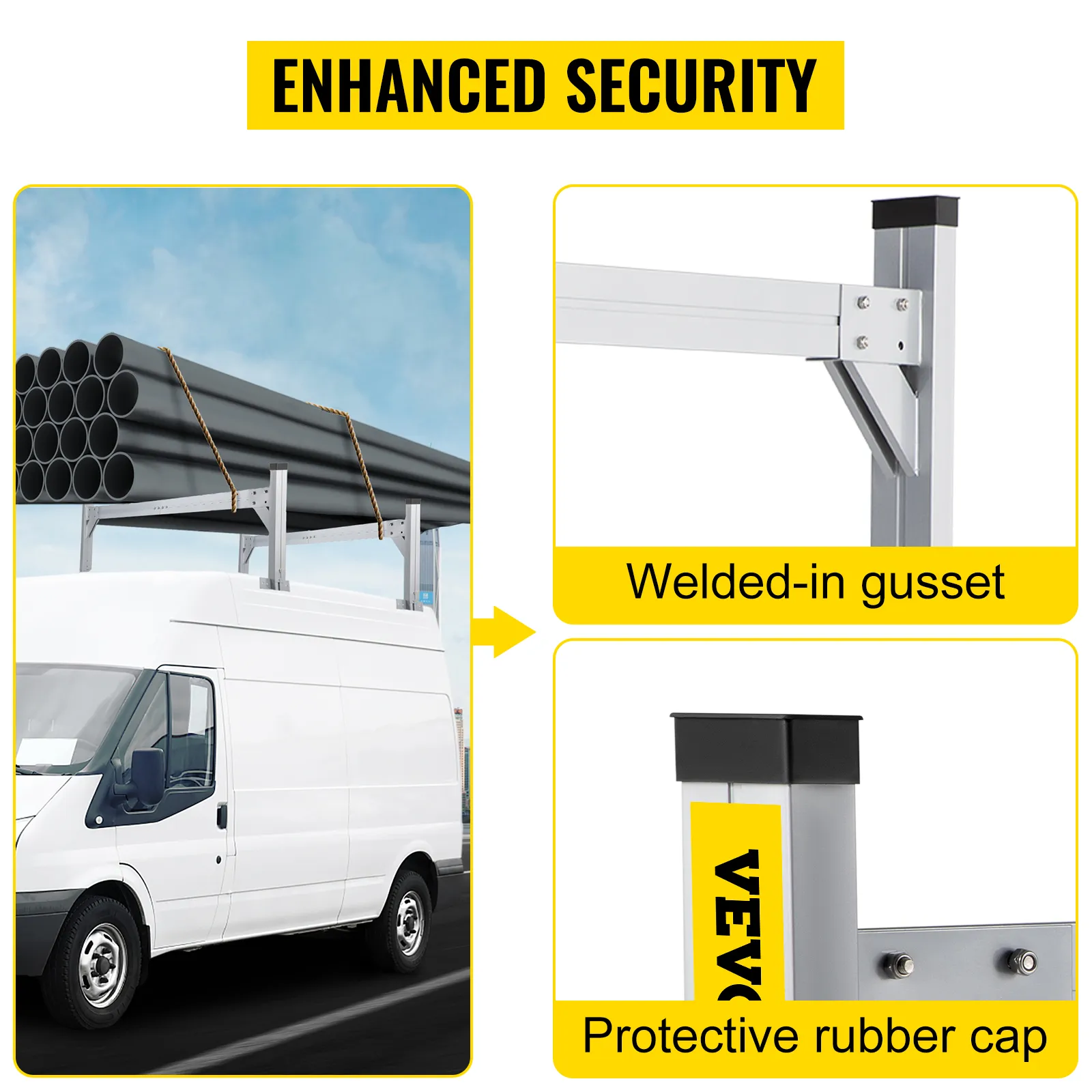 Los refuerzos soldados brindan resistencia adicional al portaescaleras y las tapas de goma evitan que se dañe la carga.
