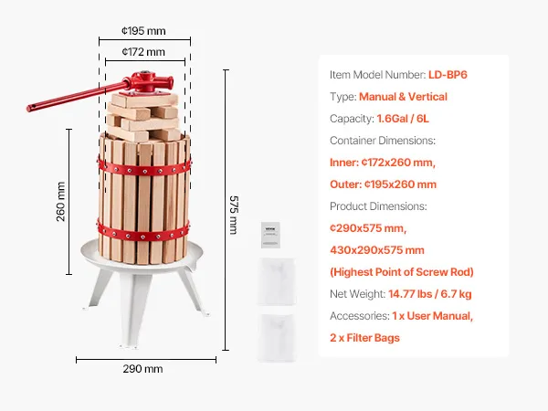 Gran capacidad: el diseño de gran capacidad de 6 l/1,6 galones es ideal para reuniones familiares, fiestas, bodegas y granjas para producir jugo abundante de manera conveniente. Las frutas duras deben triturarse antes de prensarlas y se pueden usar con la trituradora VEVOR