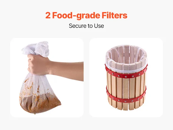 Madera de haya natural: la cesta de madera maciza está hecha de madera de haya natural, que tiene una superficie lisa y sin rebabas. La estructura de base triangular proporciona un soporte estable, lo que garantiza que nuestro prensador de vino de frutas se mantenga firme en su lugar durante el uso sin sacudidas. Además, viene con dos bolsas de filtro de calidad alimentaria para un uso seguro e higiénico.