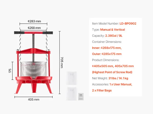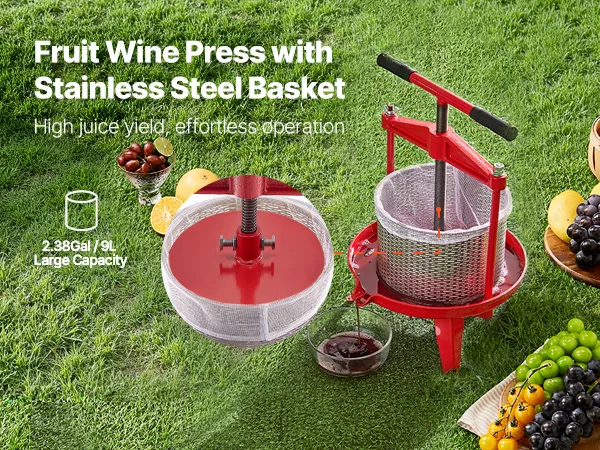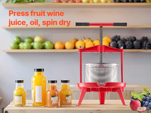La prensa de vino de frutas incluye una placa de prensado grande, lo que garantiza un prensado más completo y una extracción de jugo más rápida. El diseño de gran capacidad de 9 l/2,38 galones le permite prensar una gran cantidad de frutas a la vez para brindar jugo fresco a sus invitados.