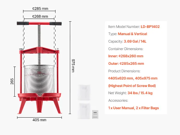 Construcción robusta: Construida con una sólida viga transversal de hierro fundido, la prensa de vino de frutas puede abrirse, lo que hace que sea conveniente cargar la canasta o colocar frutas directamente en el interior. La base triangular garantiza la estabilidad y la colocación segura en el suelo. Viene con dos bolsas de filtro de calidad alimentaria, lo que garantiza un uso seguro e higiénico.