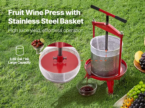 Gran capacidad: el diseño de gran capacidad de 14 l/3,69 galones es ideal para reuniones familiares, fiestas, bodegas y granjas para producir jugo abundante de manera conveniente. Para obtener los mejores resultados de jugo, triture previamente las frutas con un triturador de frutas antes de presionarlas.