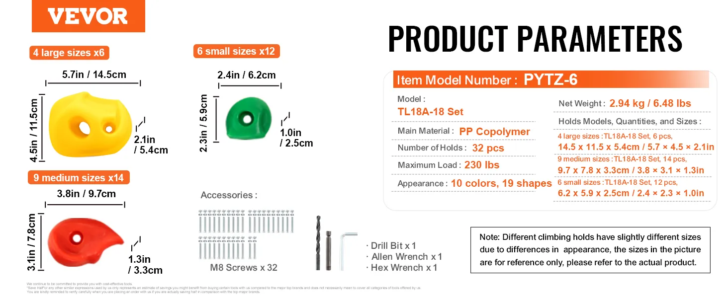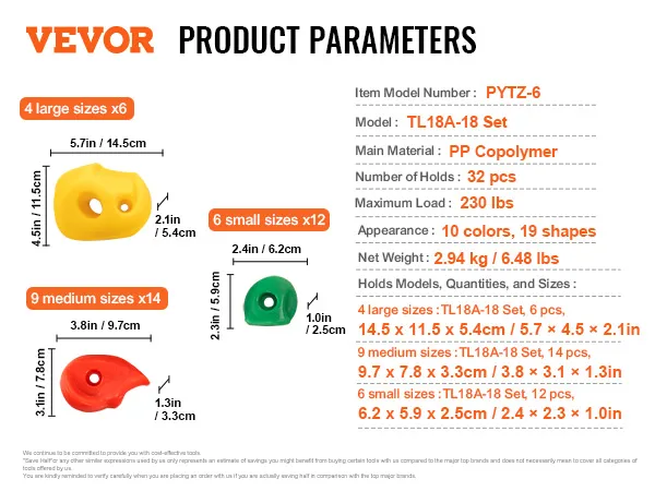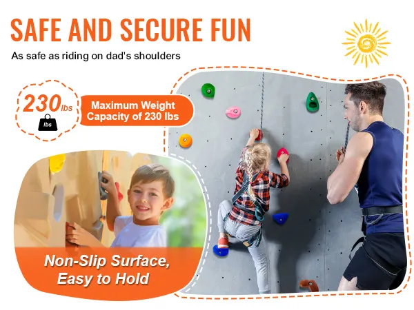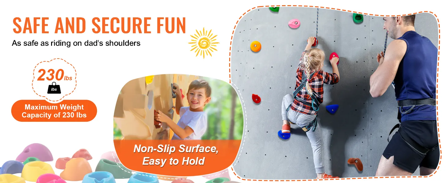 Seguro, duradero y estable: fabricados con copolímero de PP de alta calidad, nuestros soportes para escalar son duraderos y resistentes al desgaste. Con los accesorios y tornillos incluidos, estos soportes son increíblemente resistentes y soportan pesos de hasta 230 libras tanto para niños como para adultos. Estas rocas resistentes a la intemperie brindan una fuerza confiable, evitan resbalones y hacen que los escaladores se sientan tan seguros como si estuvieran sobre los hombros de su padre.