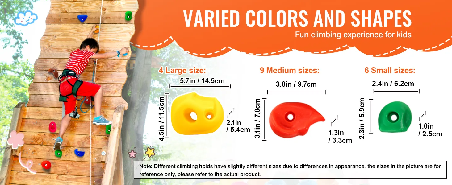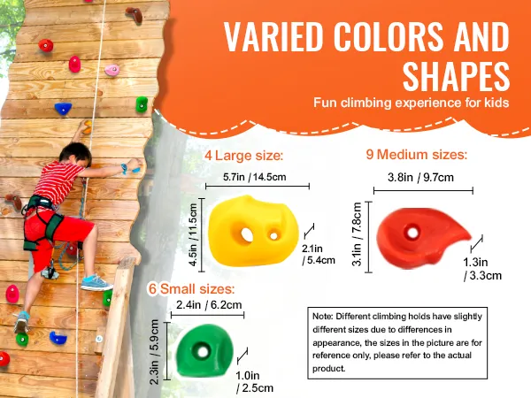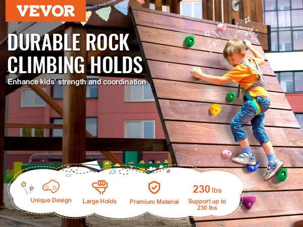 Agarre grandes y fáciles de agarrar: los agarres para muro de escalada vienen en varios tamaños. Su exclusiva superficie texturizada antideslizante los hace fáciles de agarrar y pisar, proporcionando un agarre seguro y cómodo para los niños mientras trepan. Esta actividad ayuda a mejorar la coordinación mano-ojo-pie de los niños, desarrolla su sentido del equilibrio, mejora la concentración y genera confianza y coraje.