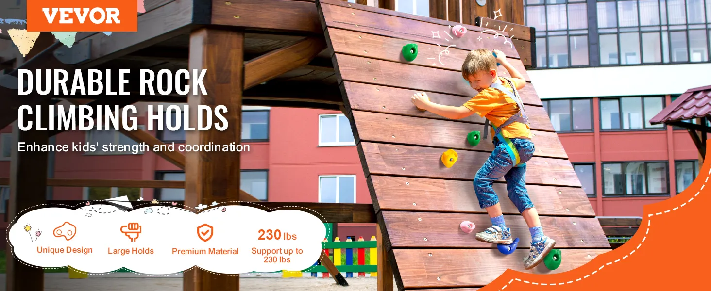 ¡Transforme su área de juego con nuestras vibrantes y duraderas presas para escalar en roca!
