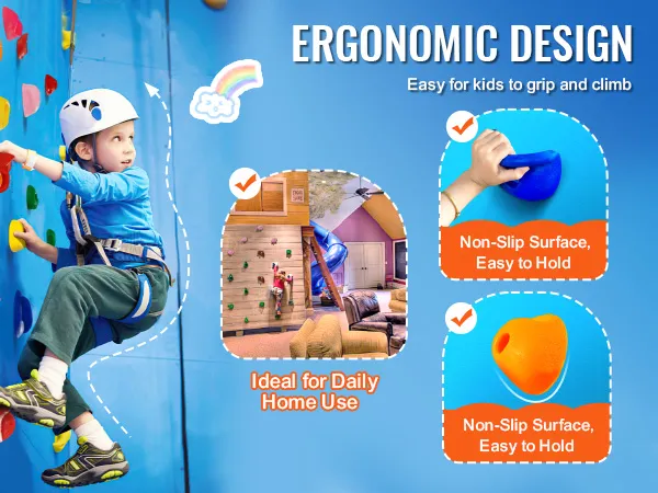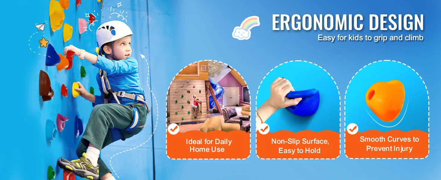 Diseñados con formas ergonómicas, curvas suaves y superficies antideslizantes, nuestros agarres para escalar son fáciles de agarrar y escalar para los niños, lo que previene lesiones y hace que la experiencia de escalar sea más placentera.