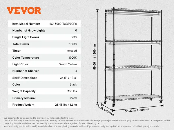 Este estante para plantas de 180 W cuenta con 6 paneles de luz LED con un espectro completo de 400 a 780 nm para todas las etapas de crecimiento de las plantas. Fabricado en acero de alta densidad, ofrece resistencia al óxido y la oxidación. Con unas medidas de 35,43 x 13,78 x 59,06 pulgadas, los 4 estantes soportan un peso total de 330 libras para exhibir varias plantas.