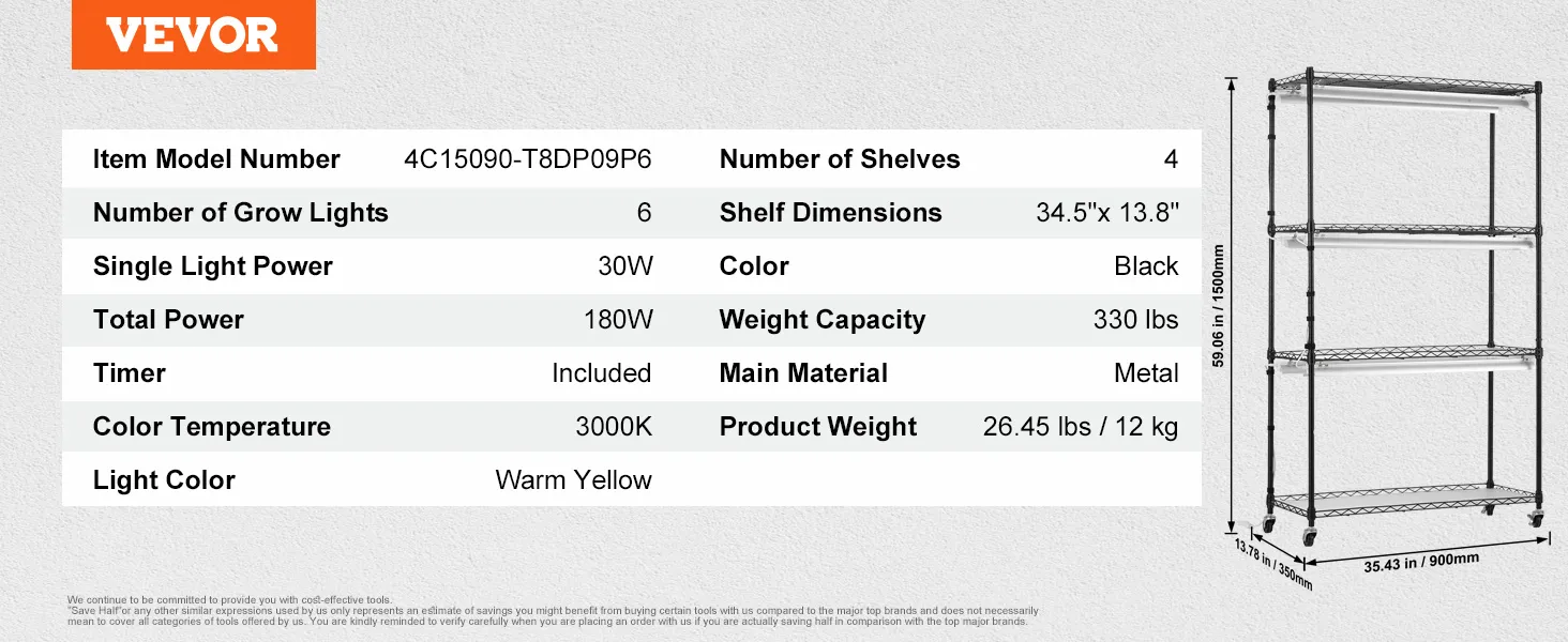 VEVOR - Soporte para plantas con luz de cultivo, estante de 4 niveles con luz LED de espectro completo de 3000 K y 180 W para plantas de interior, con temporizador para sembrar semillas (89 cm de largo x 35,8 cm de ancho x 150 cm de alto)