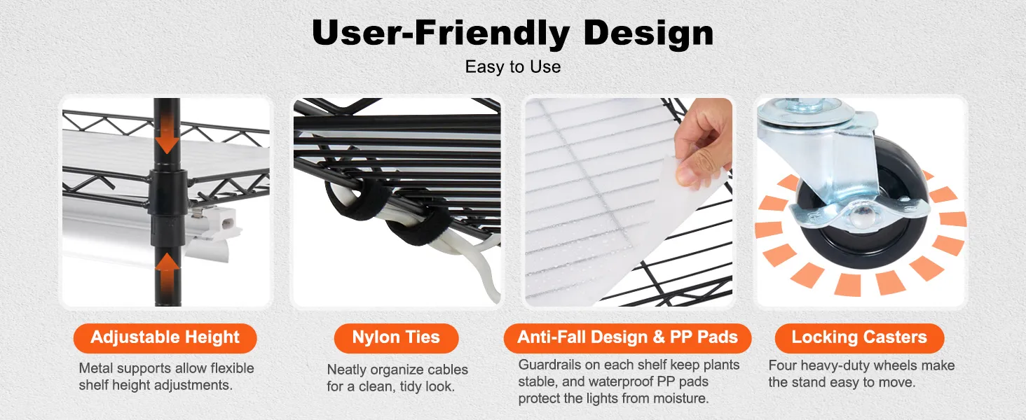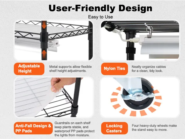 Diseño práctico y seguro: el invernadero de interior viene con una altura de rejilla ajustable que se adapta a plantas de varios tamaños. Cuatro ruedas industriales de alta resistencia hacen que mover el estante sea muy sencillo. Las almohadillas de PP tienen un diseño a prueba de fugas para evitar que las luminarias se dañen con el agua, lo que mejora la seguridad y la facilidad de uso.