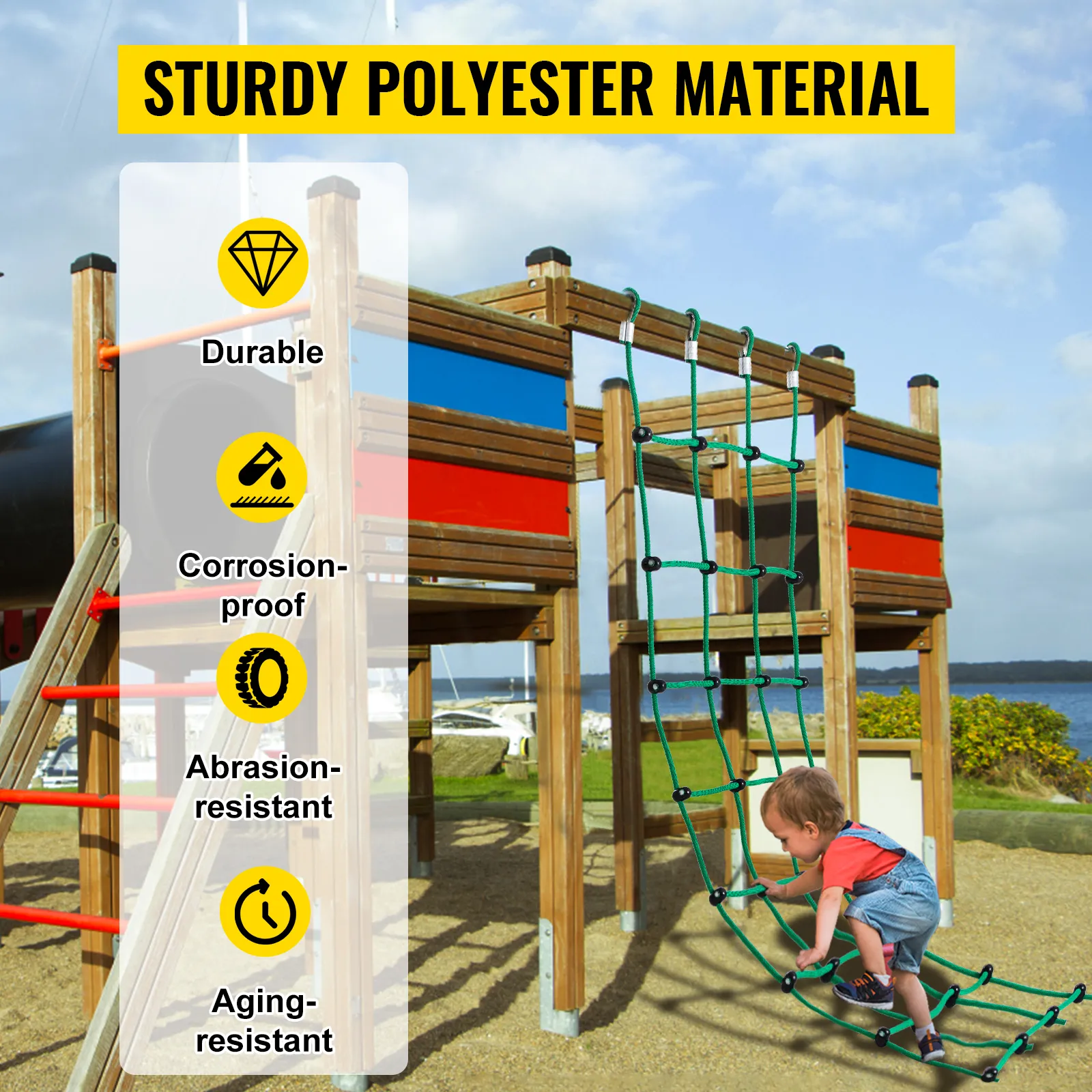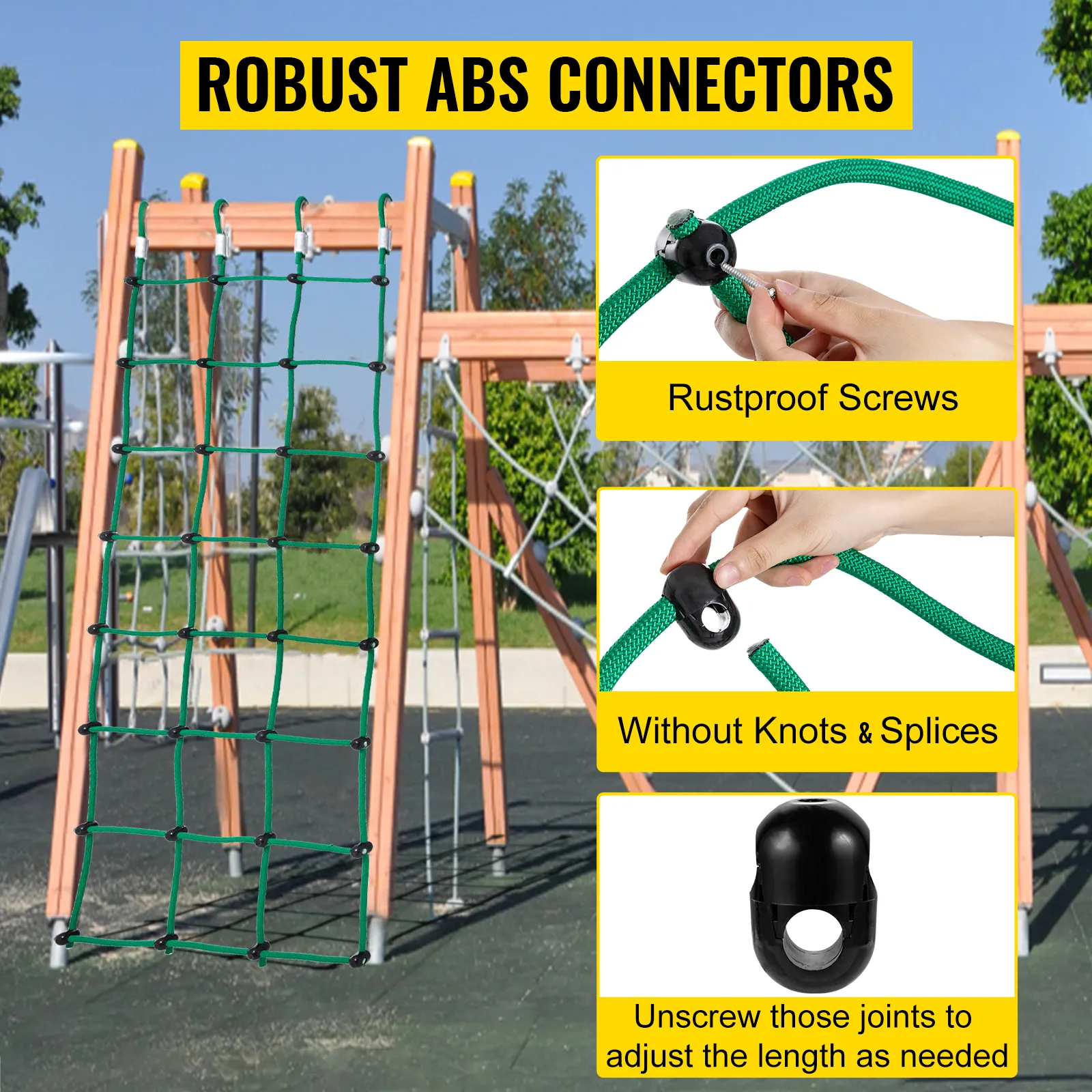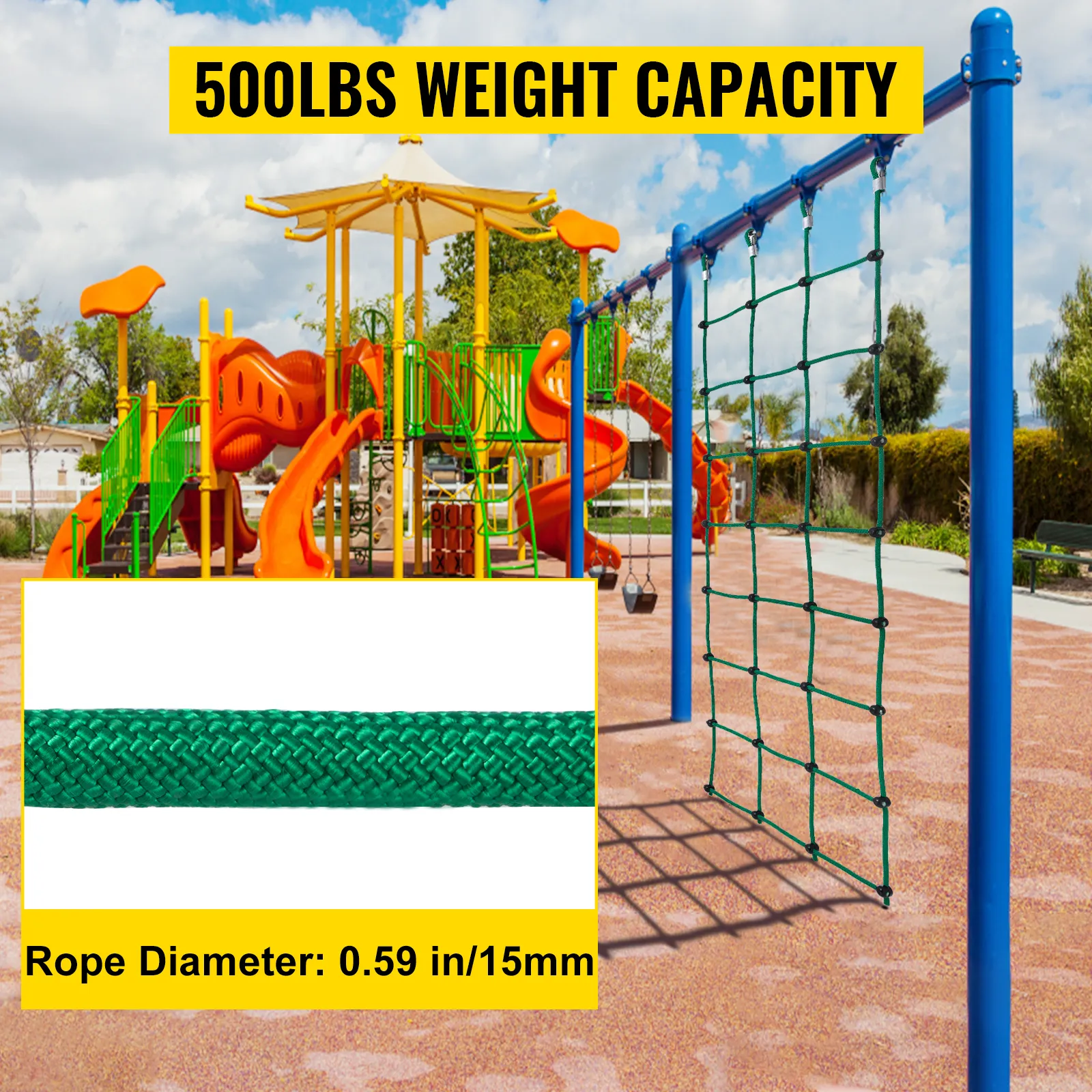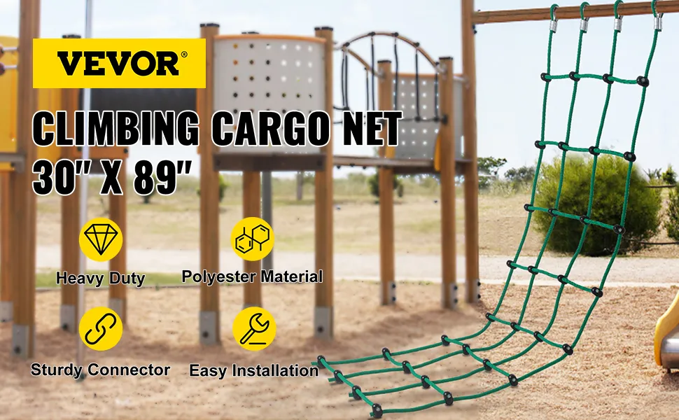 La red de escalada verde está hecha de poliéster de alta calidad, resistente y segura. Nuestra red de escalada tiene lazos reforzados con metal y juntas de ABS con una capacidad de peso de 500 libras. Puedes instalarla en varios equipos de juegos para jugar o hacer ejercicio, como columpios, muros de escalada, casas en los árboles, gimnasios de la jungla, etc. Te brindará mucha alegría y diversión a ti y a tus hijos.