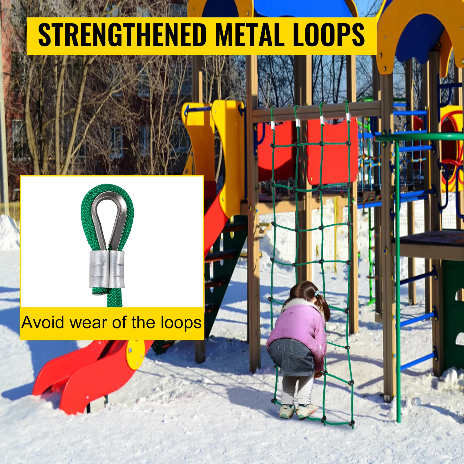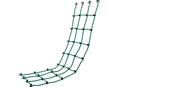 Los lazos colgantes están cubiertos por un metal liso para evitar que se desgasten o se rompan y refuerzan la seguridad de la red de escalada.