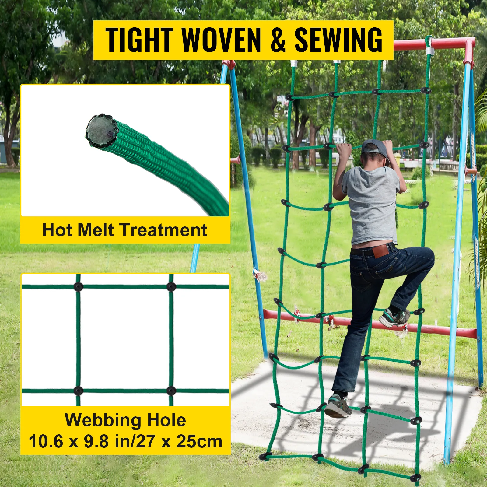 La red de escalada está tejida y cosida firmemente para una calidad y seguridad superiores. Diámetro de la cuerda: 0,59 pulgadas/1,5 cm, rejilla de cincha: 10,6 x 9,8 pulgadas/27 x 25 cm.
