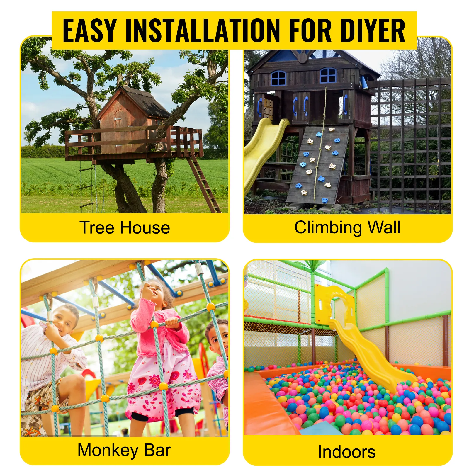 La red de escalada se puede instalar en posición vertical, horizontal o en varios ángulos, un complemento brillante para casas en los árboles, muros de escalada, barras de mono, etc. Es una opción ideal para aficionados al bricolaje creativos.