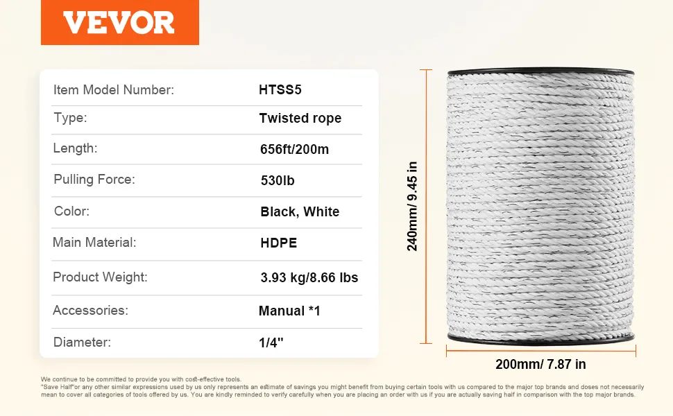 Alambre para cerca eléctrica VEVOR, alambre de polietileno portátil de 200 m y 656 pies, 6 hebras de acero inoxidable de 1/4" de diámetro para una conductividad confiable y resistencia a los rayos UV y a la corrosión. Cuerda de cercado para caballos, ganado vacuno y ganado.