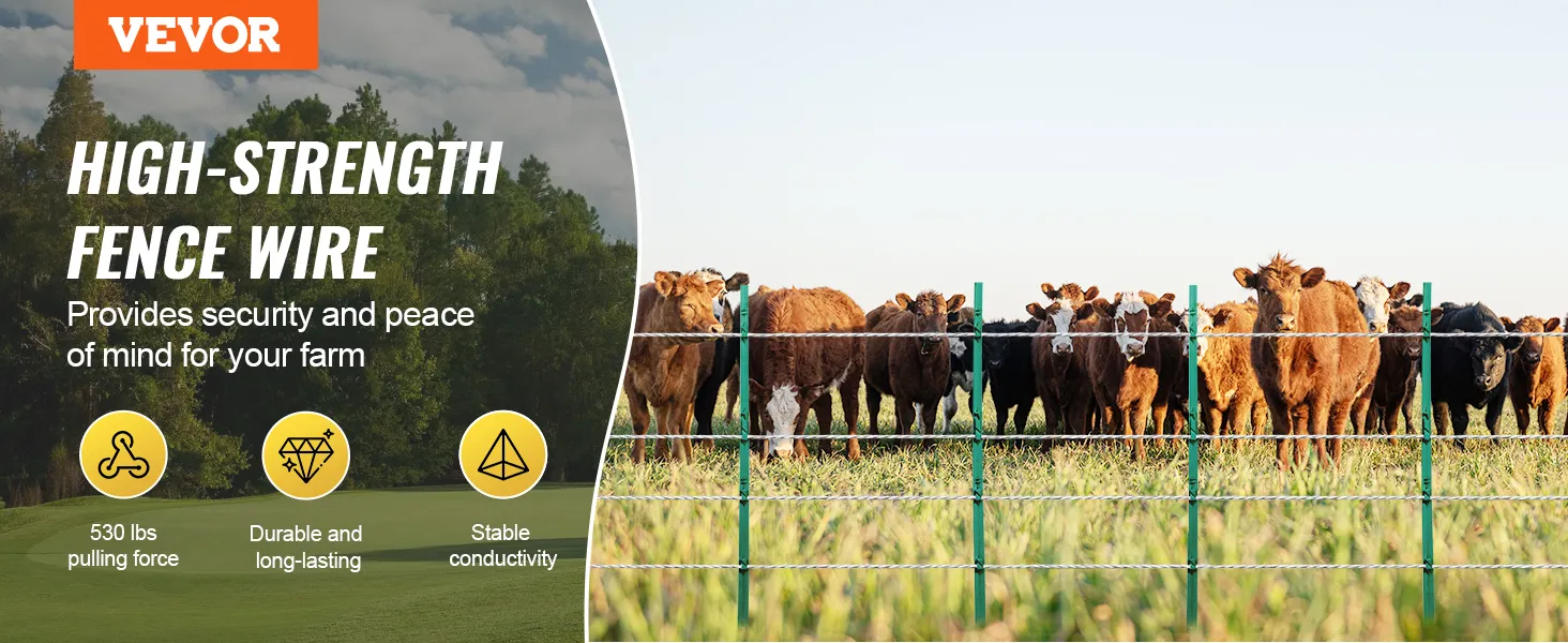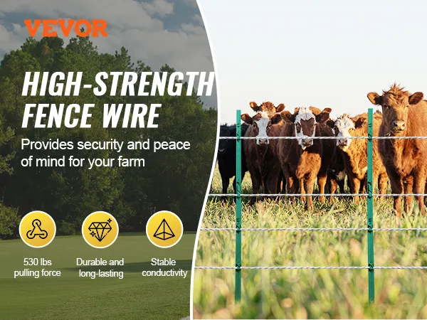 Nuestro alambre para cercas eléctricas portátiles está diseñado con una alta fuerza de tracción para garantizar su estabilidad. Soporta fuertes fuerzas de tracción y proporciona una protección fiable. Su conductividad estable garantiza una transmisión constante de corriente pulsada, manteniendo su granja segura en todo momento.