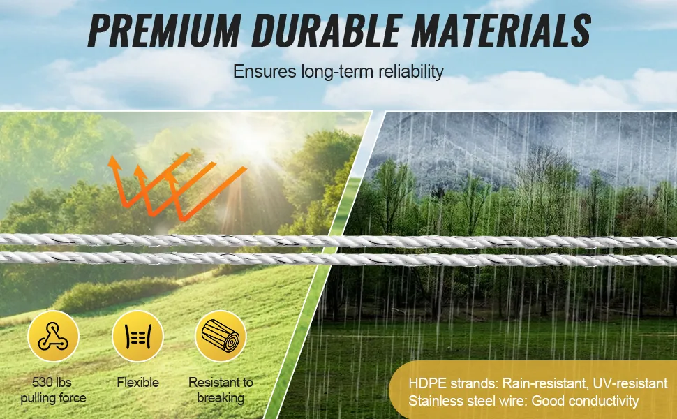 Material duradero y resistente al desgaste: El alambre de la cerca eléctrica portátil está hecho de fibras tejidas de HDPE y 6 hilos de alambre de acero inoxidable, lo que ofrece alta resistencia a la tracción y una construcción ligera. Es resistente al desgaste y a la oxidación, lo que garantiza una larga vida útil. Además, es fácil de desmontar y almacenar, sin dejar residuos en el pasto y protegiendo el medio ambiente.