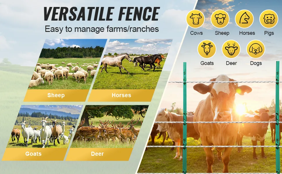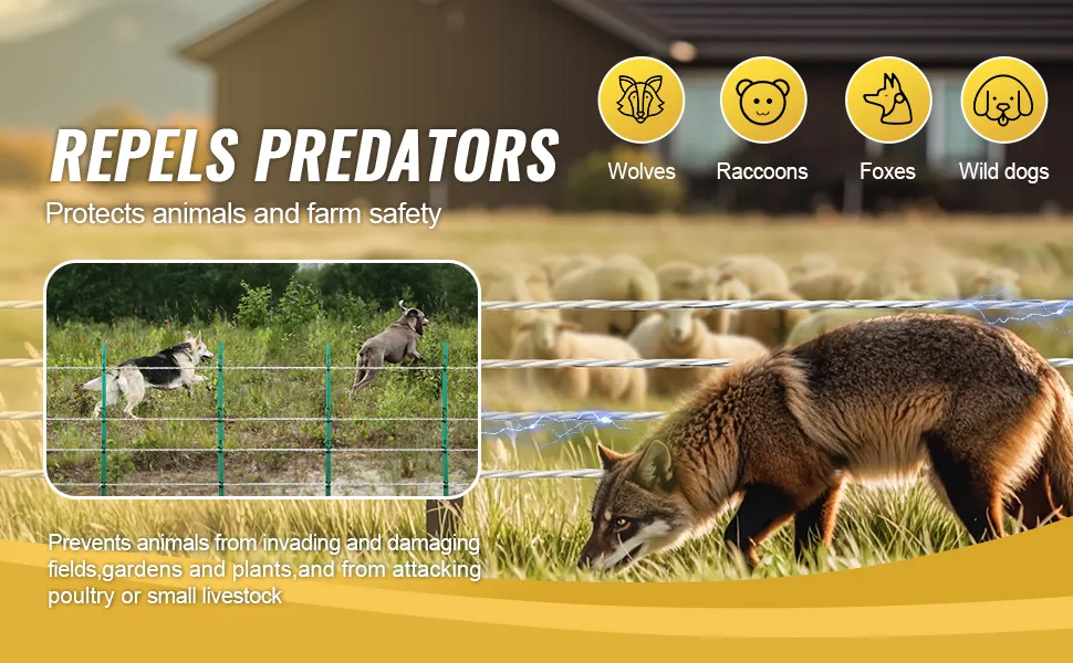 Alta conductividad: Con alambre de acero inoxidable de alta conductividad, la cerca de alambre de alta visibilidad proporciona un pulso eléctrico seguro y breve. Cuando los animales tocan la cerca, desarrollan rápidamente un reflejo condicionado que impide cualquier contacto posterior. Este diseño mantiene eficazmente a la fauna silvestre alejada de cultivos, huertos y jardines, a la vez que protege a su ganado.