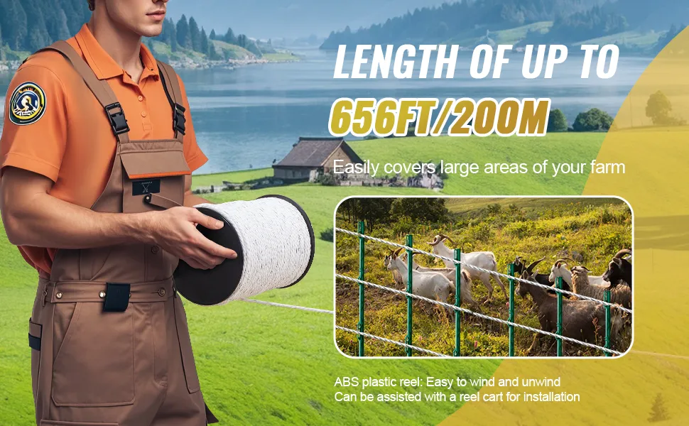 Con una longitud de hasta 200 m (656 pies), esta cerca eléctrica para ganado cubre fácilmente grandes áreas de su granja. El carrete de plástico ABS incluido facilita el enrollado y desenrollado del cable, y puede usar un carrito para el enrollado para facilitar la instalación, lo que mejora considerablemente la eficiencia.