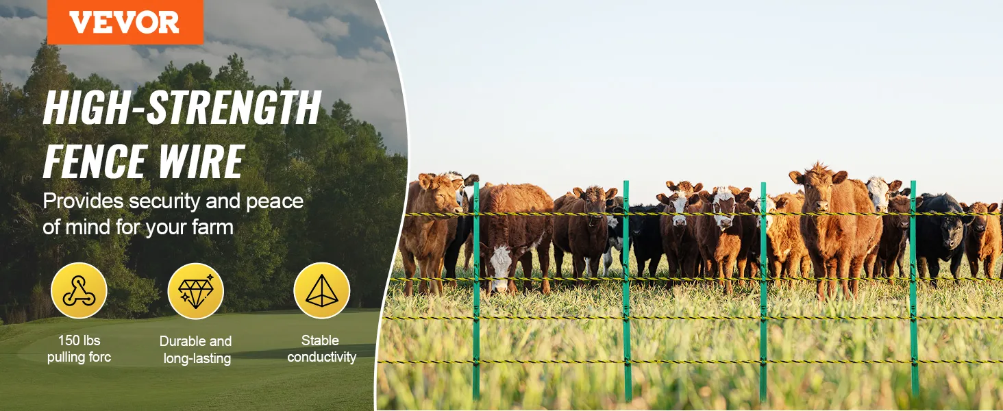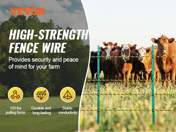 Nuestro alambre para cercas eléctricas portátiles está diseñado con una alta fuerza de tracción para garantizar su estabilidad. Soporta fuertes fuerzas de tracción y proporciona una protección fiable. Su conductividad estable garantiza una transmisión constante de corriente pulsada, manteniendo su granja segura en todo momento.