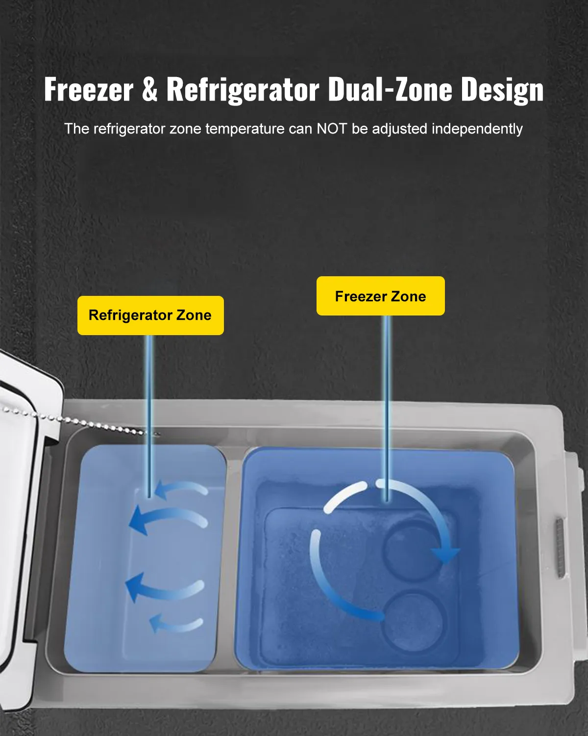 Con un funcionamiento de 12/24 V CC y 110-240 CA, el frigorífico-congelador de 12 V se puede conectar al encendedor de cigarrillos de un automóvil ya la fuente de alimentación doméstica. Un refrigerador de compresor portátil es adecuado para vehículos recreativos, campamentos, botes, campamentos, pesca, viajes por carretera y actividades al aire libre.