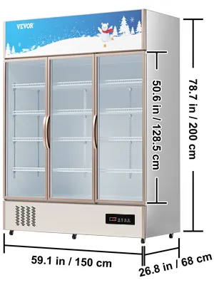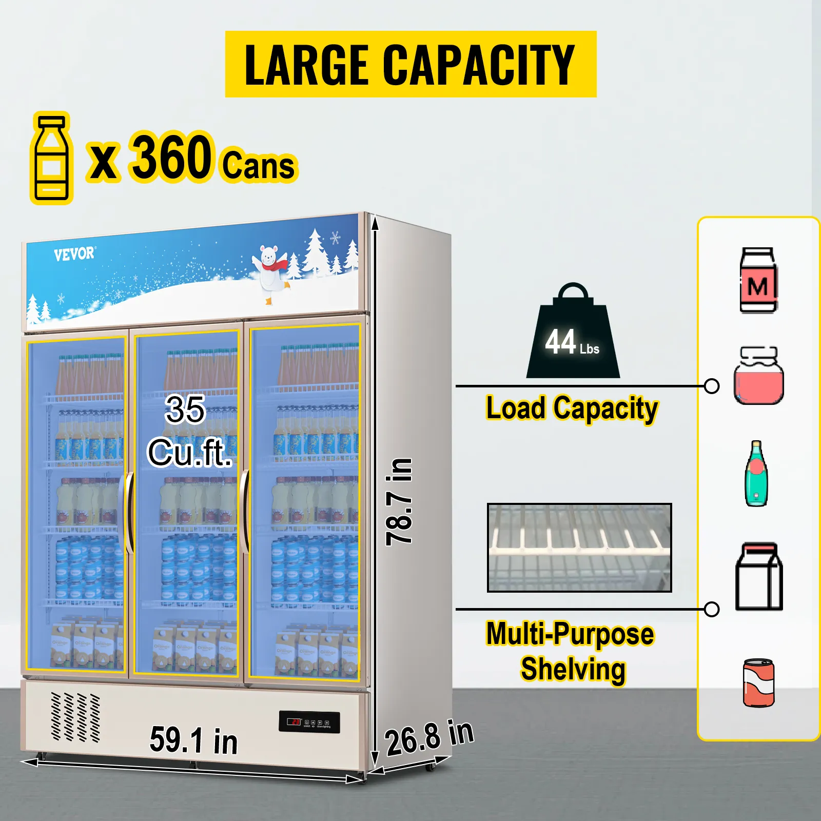 78.7" Tall x 59.1" Wide x 26.8" Deep - 35 Cubic feet Capacity. Each glass front refrigerator features 4 shelves that can be moved up or down to create more customizable spaces. Each shelf can hold up to 24 standard-sized soda cans.