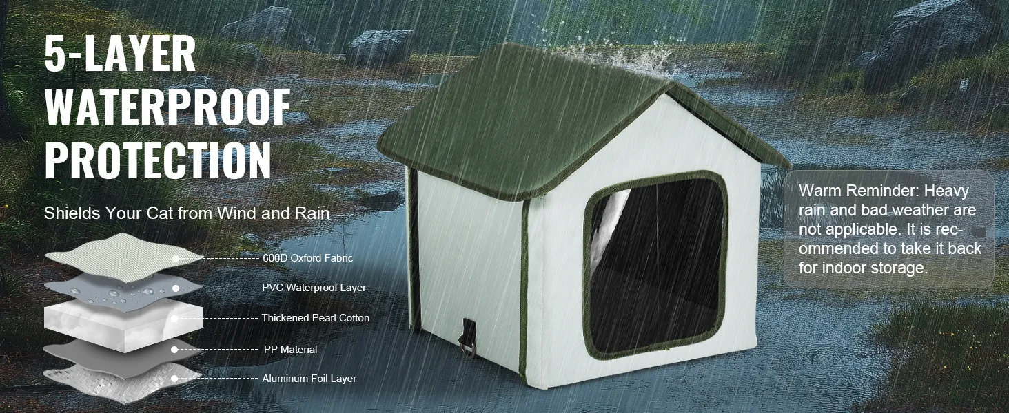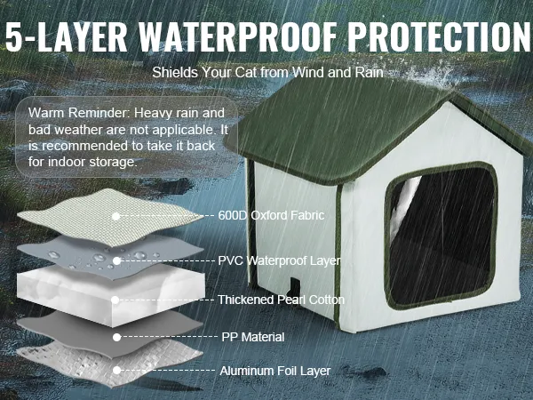 El refugio ofrece una gran protección para su gato contra los cambios climáticos gracias a sus 4 capas de materiales. La capa exterior consta de un revestimiento impermeable de PVC y tela Oxford 600D para evitar la infiltración de agua de lluvia, mientras que la capa interior mejora el aislamiento con algodón perlado grueso y papel de aluminio.