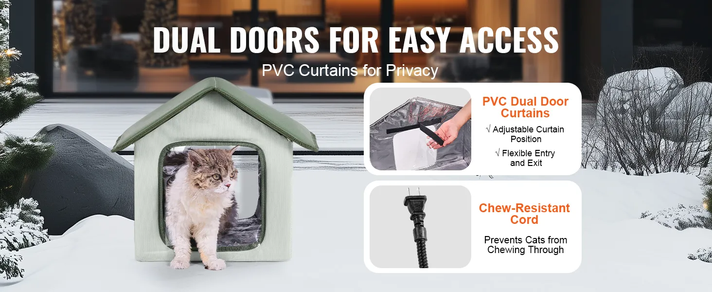 Este refugio para gatos está especialmente diseñado con puertas dobles de entrada, cada una equipada con cortinas de PVC ajustables. Este diseño permite que su gato entre y salga libremente y, al mismo tiempo, le brinda protección de privacidad. Las cortinas bloquean los vientos fríos y permiten que su gato se sienta seguro al observar los alrededores.