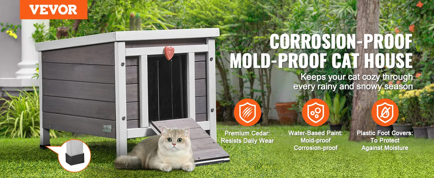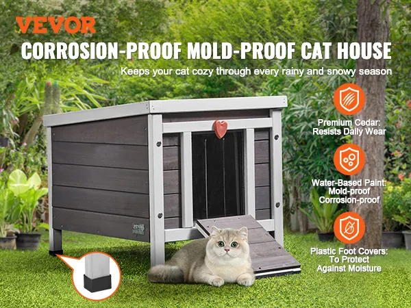 Esta caseta para gatos para exteriores, hecha de madera de cedro de alta calidad y recubierta con pintura a base de agua, ofrece protección multicapa, que es resistente a la corrosión. Cuatro almohadillas impermeables para las patas mejoran las características impermeables. ¡Garantiza la seguridad y la salud de tu gato!