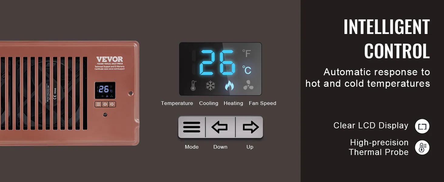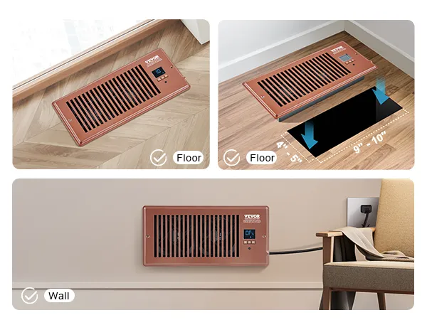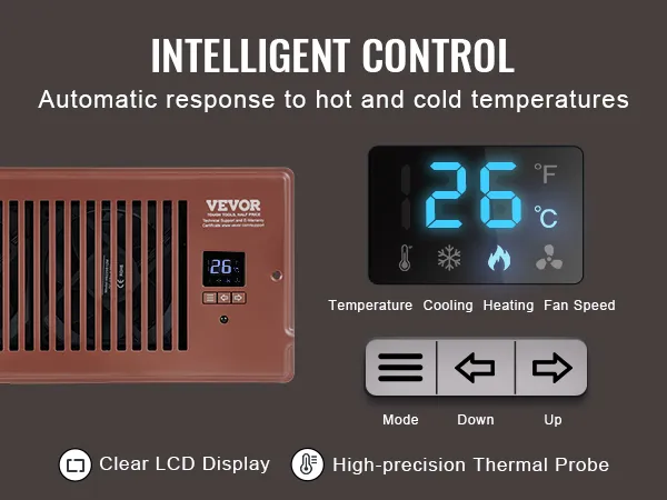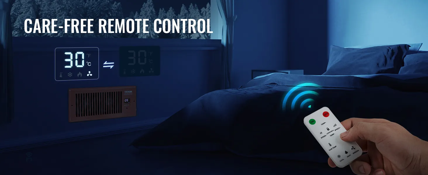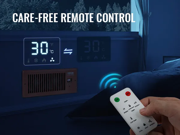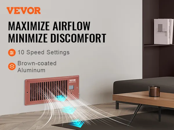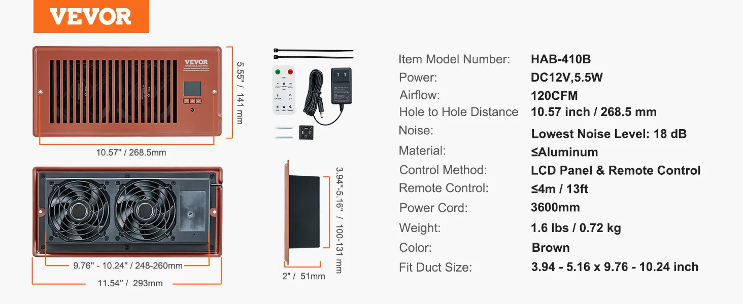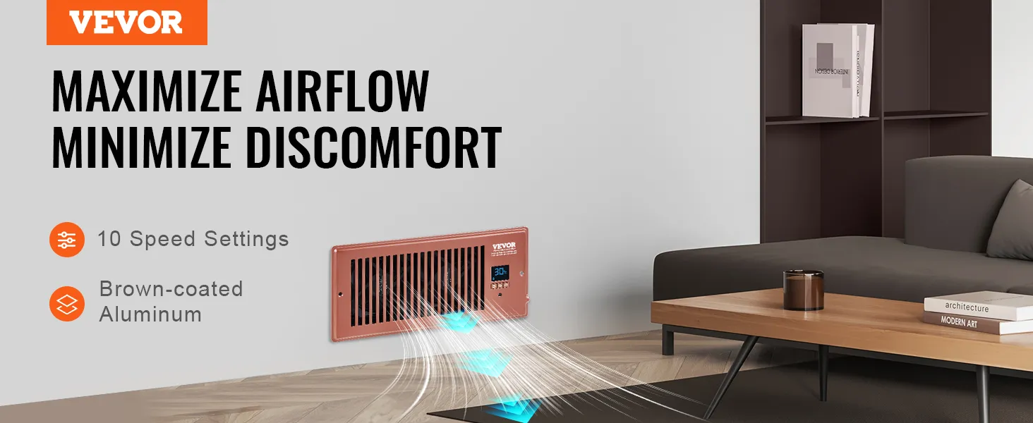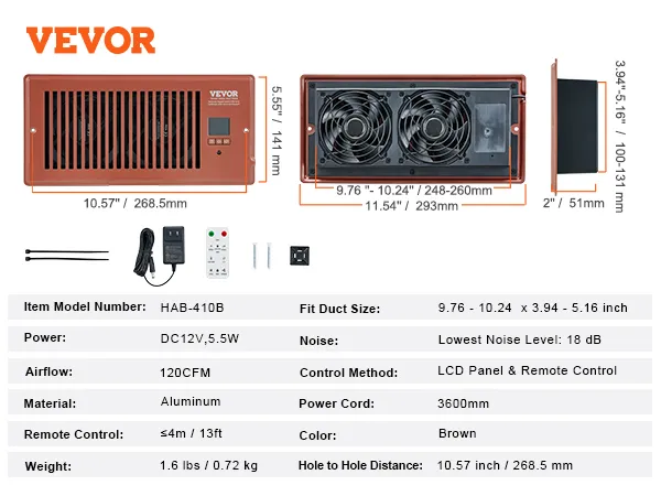 Ventilador de ventilación VEVOR con registro de 4 x 10 pulgadas, silencioso, con control remoto y termostato, velocidad ajustable para calefacción, refrigeración y ventilación inteligente, color marrón.