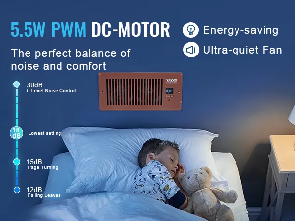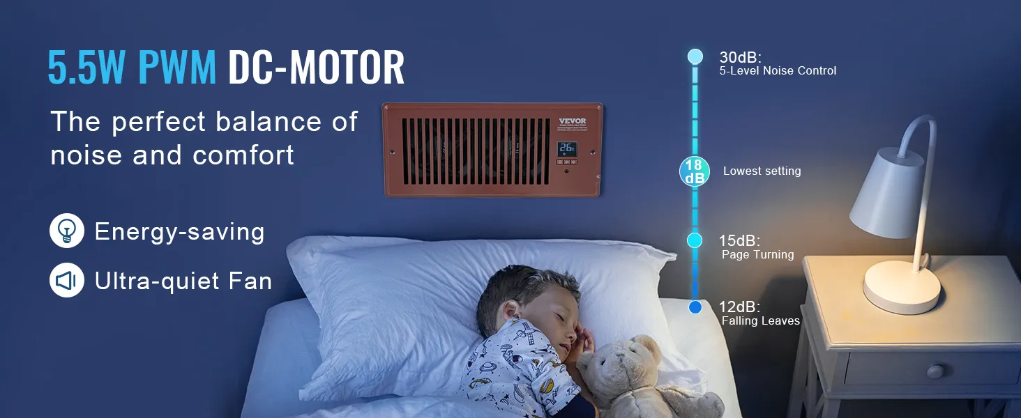 Motor PWM de bajo consumo: nuestro ventilador cuenta con un motor de CC PWM de 6 W, que no solo garantiza un flujo de aire óptimo sino que también consume una energía mínima. Esto se traduce en una reducción de las facturas de electricidad y un menor impacto medioambiental. Además, nuestros ventiladores de refuerzo funcionan silenciosamente y emiten niveles de ruido de ≤18 dB, para que pueda disfrutar de un sueño reparador sin ser molestado.