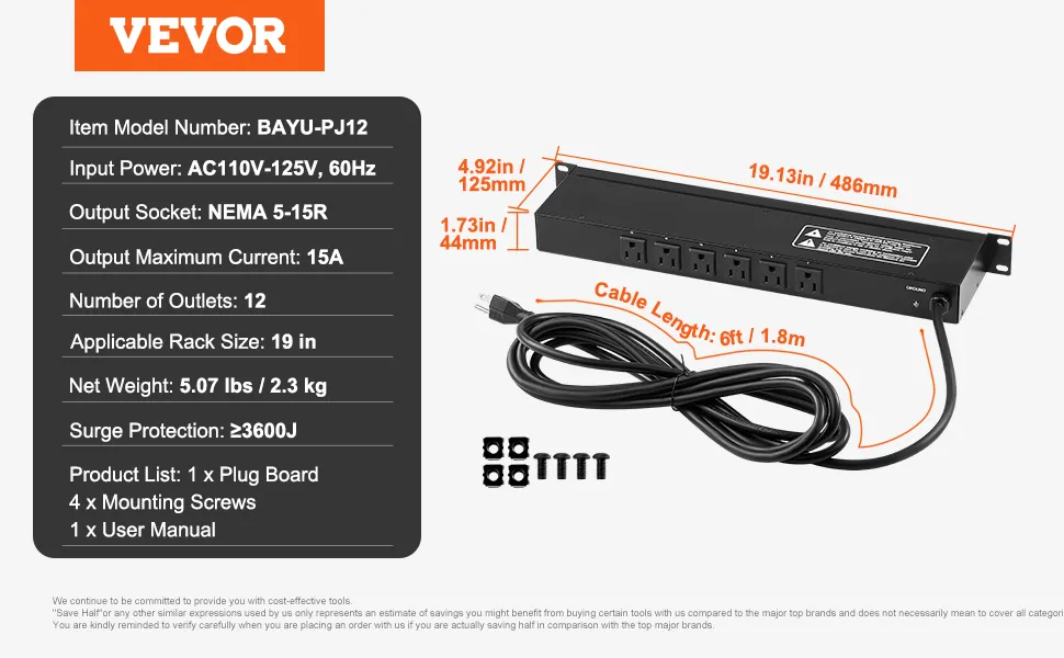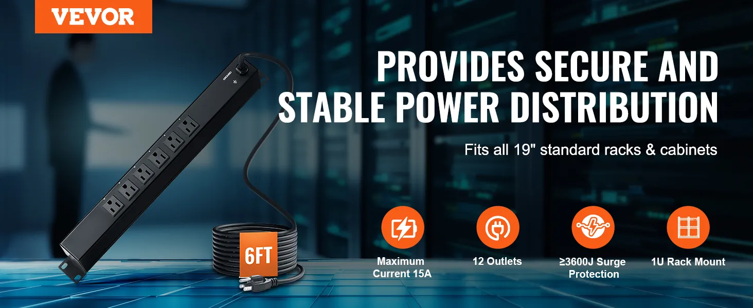 PDU VEVOR 1U, 12 tomas de corriente, regleta de montaje en rack compatible con racks de servidores estándar de 19", con interruptor integrado de protección contra sobretensiones y sobrecargas, 110-125 V/15 A, ideal para el hogar y la oficina.